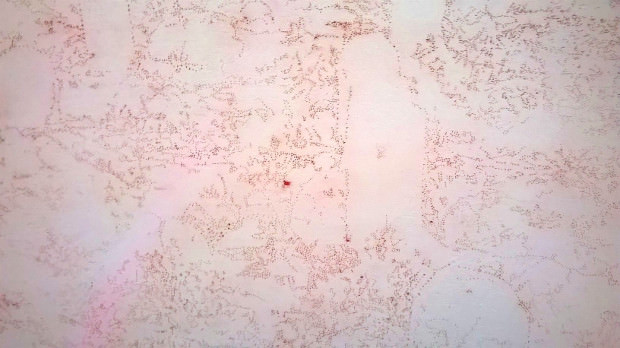 “A L’Aquila accedo realizzando un lavoro sospeso, sopra le nostre teste e sotto i nostri piedi. Gli spazi vuoti sono agiti da una presenza scura e pesante. Il soffitto del soppalco che abita tutto lo spazio Varco è dipinto di un colore bruno dove sono fissati con dello scotch colorato alcuni disegni, I terribili disegni della morte; nel soppalco invece un salotto, appositamente allestito, ospiterà gli spettatori che potranno ascoltare i cosiddetti I racconti funesti, 37 racconti brevi che parlano di esistenze e inesistenze, opera audio, una scultura filodiffusa nello spazio: sopra è come stare sospesi tra nuvole e abisso. Un piccolo spolvero infine, Final, e un piccolo quadro, Tutta la stanza tintinna avvisano la sottile e Nostra esistenza: fino a quando ho un’idea nascerò di nuovo.” (F.L.)