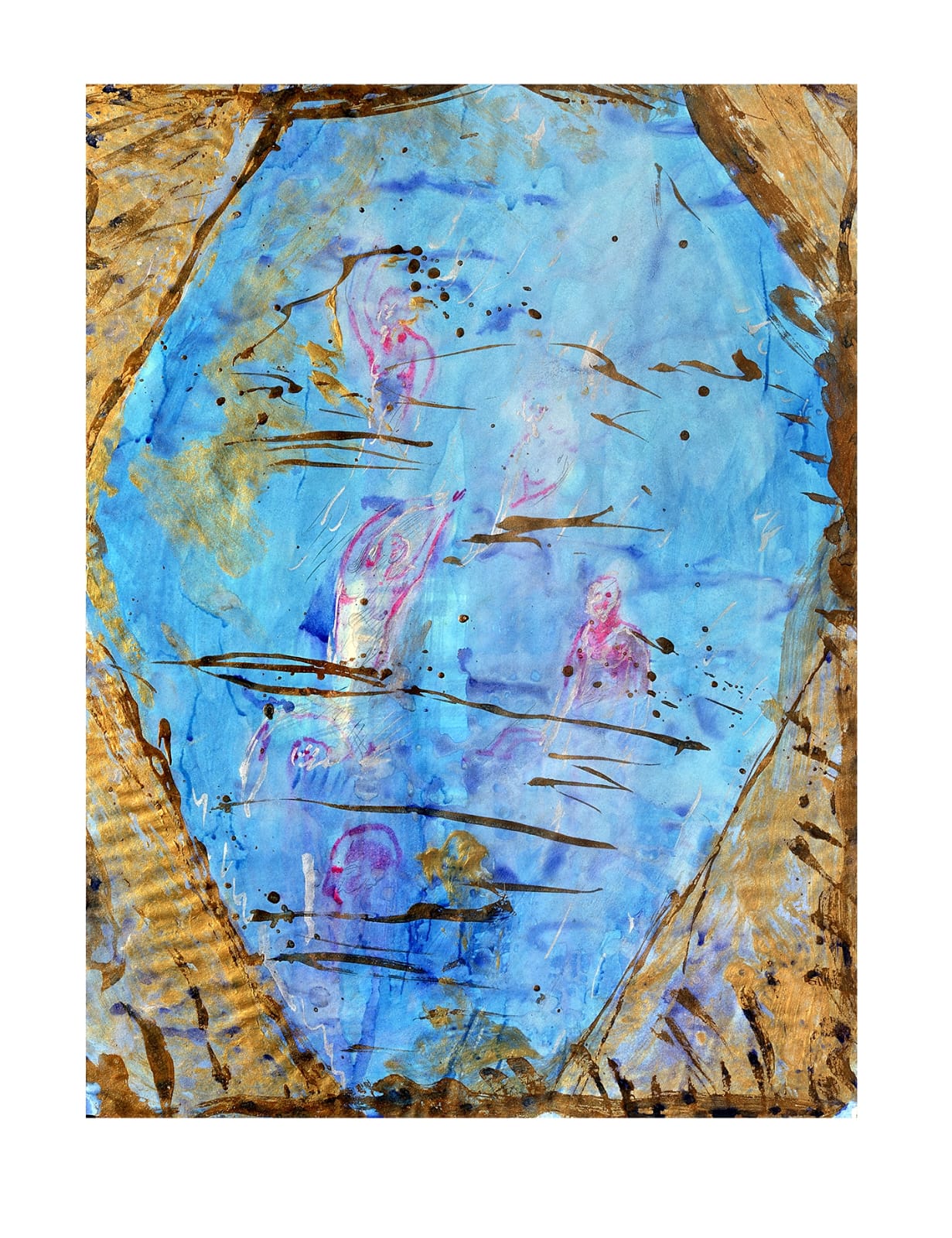 I cartoni della serie Bagnanti approcciano il motivo dal punto di vista più immediato, più sommario. L’immagine frammentata emerge dal blu, ricomponendosi davanti ai nostri occhi grazie alla velocità dell’esecuzione che però richiede all’artista la massima concentrazione. L’utilizzo dell’oro accentua la preziosità dei blu, dell’acqua e la magia dei mondi dipinti.