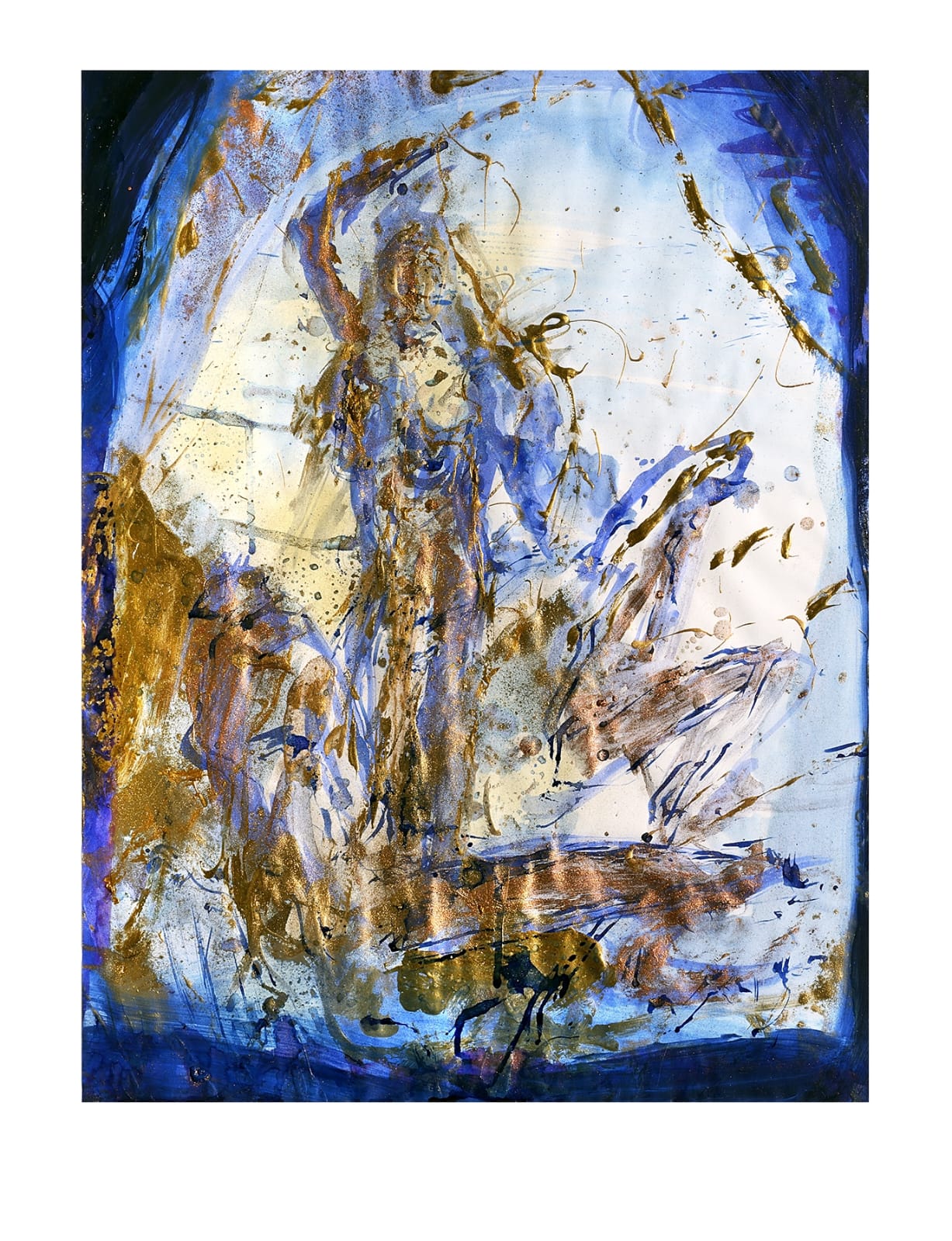 view. The fragmented image emerges from the blue, recomposing itself before our eyes. This effect is achieved thanks to the speed of execution which, however, requires maximum concentration from the artist. The use of gold accentuates the preciousness of the blues, of the water and adds to the magic of the painted worlds.
