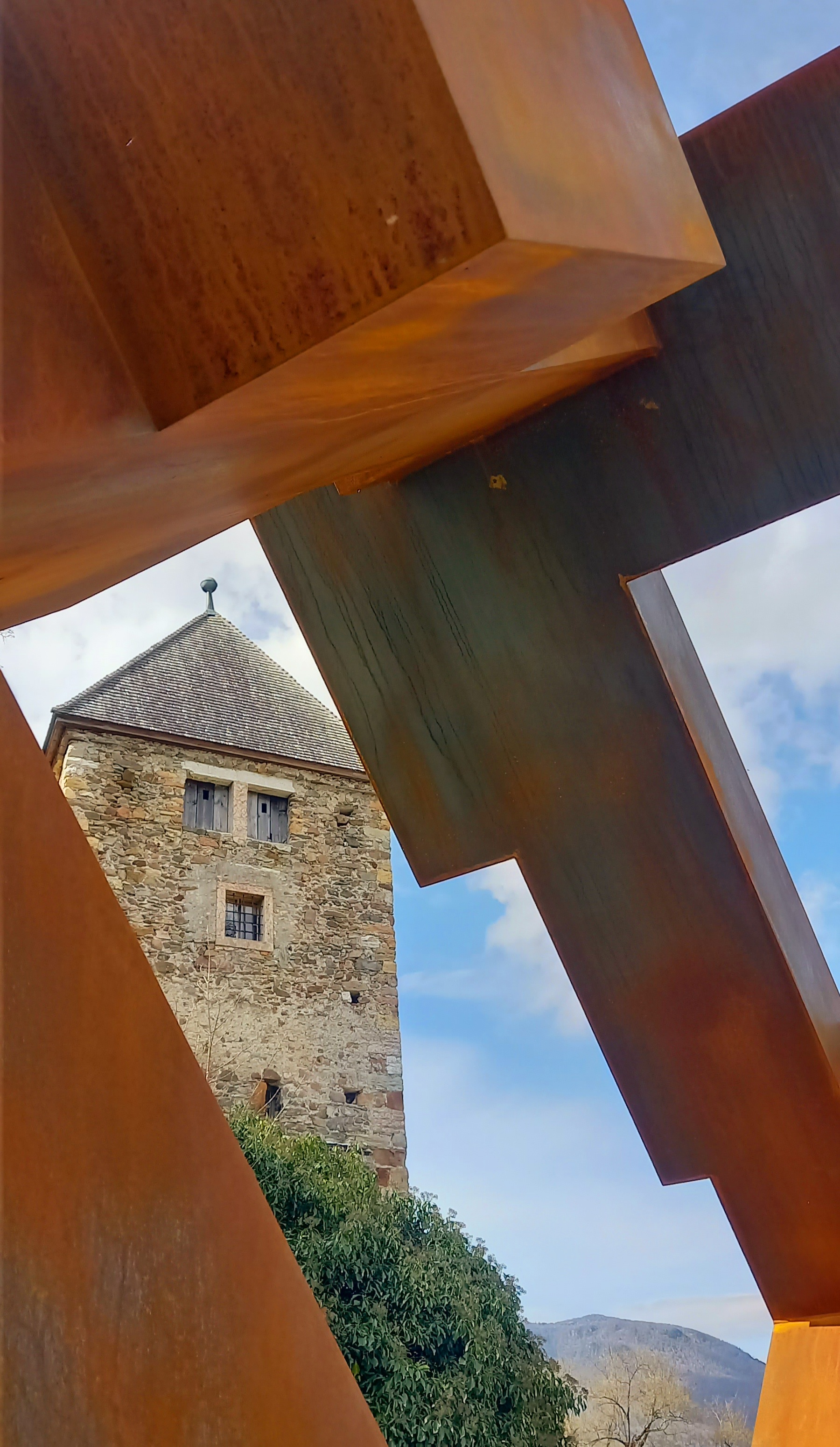 Una scultura che canta mentre costruisce un tempio della porta: La Porta delle Stelle. Il suo canto è un inno alla relatività della vita, un’ode all’armonia universale. Un coro dell’attimo eterno, espressione del tutto comune. Simbolo del sentimento dell’ignoto e dell’inconoscibile.Apoteosi dell’estetica del vuoto – perché, come disse Esiodo, senza il vuoto il suono non nascerà. È un’apologia dell’Essere. Spaziotempo è una condizione esistenziale e relazionale, dove passato e presente si intrecciano e sussurrano versi fatti di elementi meccanici e industriali. Un luogo, dove il magma cristallizzato nel granito, abbraccia la ruggine del ferro e si veste di cielo. Il castello diventa una scultura, un meccanismo-organismo di pensieri, di sensazioni e di bellezza, un viandante che attraversa il tempo e lo spazio toccando l’eternità. ( Dora Bulart, critica d`arte)