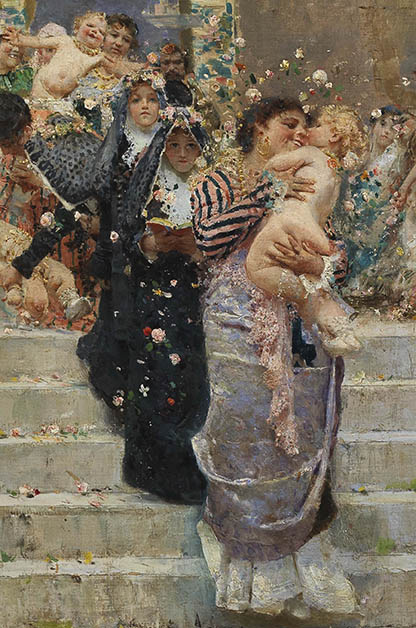 La mostra “Michetti - La luce e il segno” presenta al pubblico un importante insieme di opere del maestro abruzzese, oltre ottanta, in cui è evidente il percorso dalla pittura di luce del primo periodo alla ricerca dell'essenza della forma tipico dell'ultimo. A rappresentare il Michetti giovanile è forse il suo quadro più importante La Processione del Corpus Domini a Chieti, mentre i passi successivi sono ben esplicati da un significativo nucleo di opere, in gran parte provenienti dal fondo ereditario dell'artista. Da sottolineare la presenza in mostra del Corpus Domini, dipinto presentato con clamore in occasione dell’Esposizione Nazionale di Napoli del 1877 ed entrato a far parte in breve della prestigiosa collezione dell’Imperatore di Germania: senza dubbio è uno dei quadri più importanti e significativi del secondo Ottocento in Italia. Con quest'opera l’autore prendeva la leadership dell’emergente scuola partenopea e ne influenzava per un decennio gli orientamenti, con ripercussioni in tutte le scuole regionali. Michetti, omaggiato Domenico Morelli con il riferimento alla Madonna della Scala d'oro nella figura centrale e assimilata con acutezza la lezione giapponista di Mariano Fortuny, conquistò pubblico e critica, pur tra le inevitabili polemiche. E’ il critico d’arte, nonché pittore, Francesco Netti, ad individuare alla perfezione le qualità del dipinto: il “vero progresso” consisteva nell’eliminazione di quella “tinta-base” che “smorza”, “avvelena”, “ed abbassa insensibilmente tutta la intonazione del quadro”. Nell'opera predominano “i colori chiari e freddi” ad imitazione della pittura giapponese, che procede appunto per “toni locali ed interi” e con un comporre piatto che annulla la profondità prospettica. Ecco fondato, agli occhi di Netti, l’Impero del bianco, una nuova pittura di luce, esemplata sulla lezione di Fortuny, che rinnova di fatto la pittura italiana sulla scia del naturalismo internazionale. Allorché Michele Uda, altro scrittore d’arte di posizioni conservative, si scagliò contro la nuova tendenza pittorica accusandola di “intenzionismo” e di “impressionismo”, non si è lontani dalle celebri critiche lanciate da Louis Leory con l'articolo la “Mostra degli Impressionisti” pubblicato sul Charivari del 25 aprile del 1874. E questa operazione rivoluzionaria viene compiuta da Michetti nel Corpus Domini con una facilità - scriveva Netti che la difficoltà del creare in genere fa soffrire l'artista mentre al maestro abruzzese “fa godere” - che in questa occasione espositiva è nuovamente sotto gli occhi di tutti.