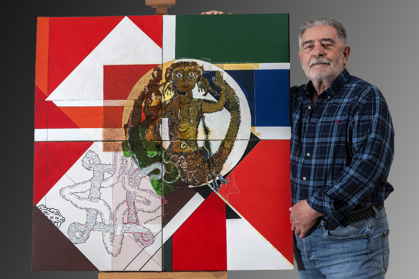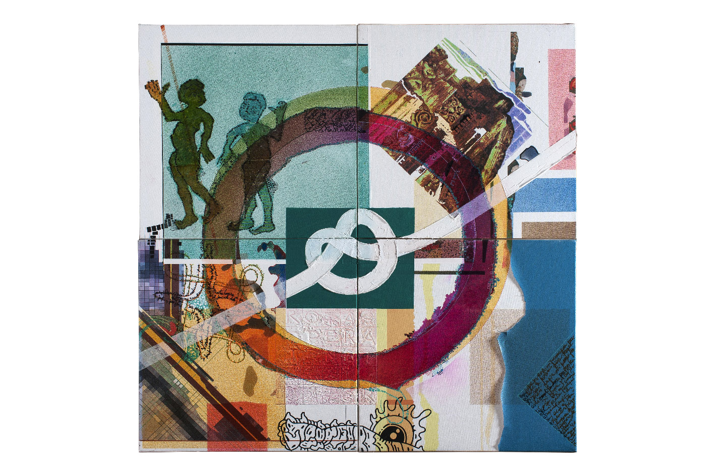 Tele che dialogheranno con le antiche macchine per la stampa situate nelle sale dell’ex Convitto Palmieri quasi a sottolineare il rimando alla scrittura sempre presente nelle opere di Francesco Pasca, artista a tutto tondo, scrittore, matematico e architetto che ha elaborato una propria tecnica che unisce insieme il digitale, l’elaborazione fotografica, il collage, gli stucchi e il colore puro. Giocando a contaminare la superficie pittorica di cifre e lettere, di figure e simboli si diverte a creare complesse narrazioni da decifrare. «A questi elementi - spiega lo stesso Cipriani - si aggiungono inserti eseguiti ad uniposca nero da Massimo Pasca, figlio di Francesco, artista e sua progenie e, per questo, anche lui suo doppio. Padre e figlio s’incontrano sulla tela con interventi perfettamente integrati eppure riconoscibili nella loro individualità, coerenti con il loro rispettivo modo di fare arte.» Riconducibili alla forma del quadrato, le sue opere si compongono come moduli in cui è possibile rintracciare ciò che gli antichi indicavano come la divina proportione” ovvero la sezione aurea del segmento, e costruiscono un immaginario, una sorta di puzzle ideale, dove passato e memoria si intrecciano con la ricerca di identità e il desiderio di comunicare il suo personale sguardo sulla realtà.