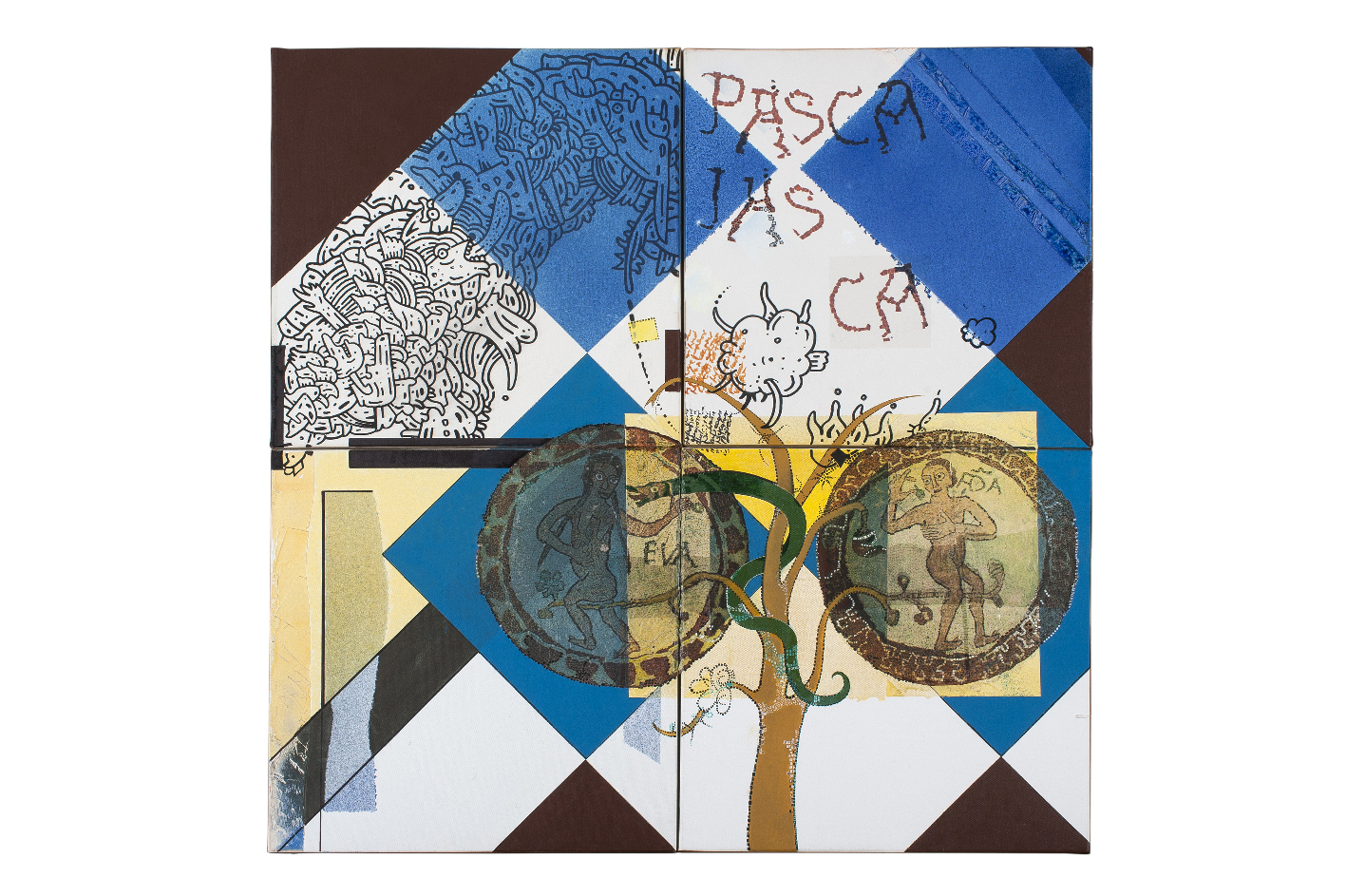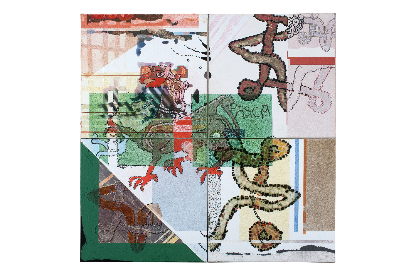 Incentrata sul concetto di dualità, con un evidente richiamo alla duplicità di figure rintracciabili nello straordinario tappeto musivo della Cattedrale di Otranto, Francesco Pasca ancora una volta lega la sua ultima produzione pittorica alla sua produzione poetica condensando il frutto di una ricerca lunga e costante. Una ricerca partita negli anni Ottanta, parallelamente all’adesione al Gruppo Granma e al Manifesto della Singlossia che lo vede protagonista di performance poetiche a Milano come a Palermo con Rossana Apicella, Ignazio Apolloni, Michele Perfetti, Eugenio Miccini e tanti altri e che porta avanti tuttora nell’adesione al tema della Singlossia come scelta e al Non senso dell’universo dedicandosi alla scrittura, alla pittura, ai linguaggi multimediali che per lui in internet trovano l’eredità diretta della singlossia.