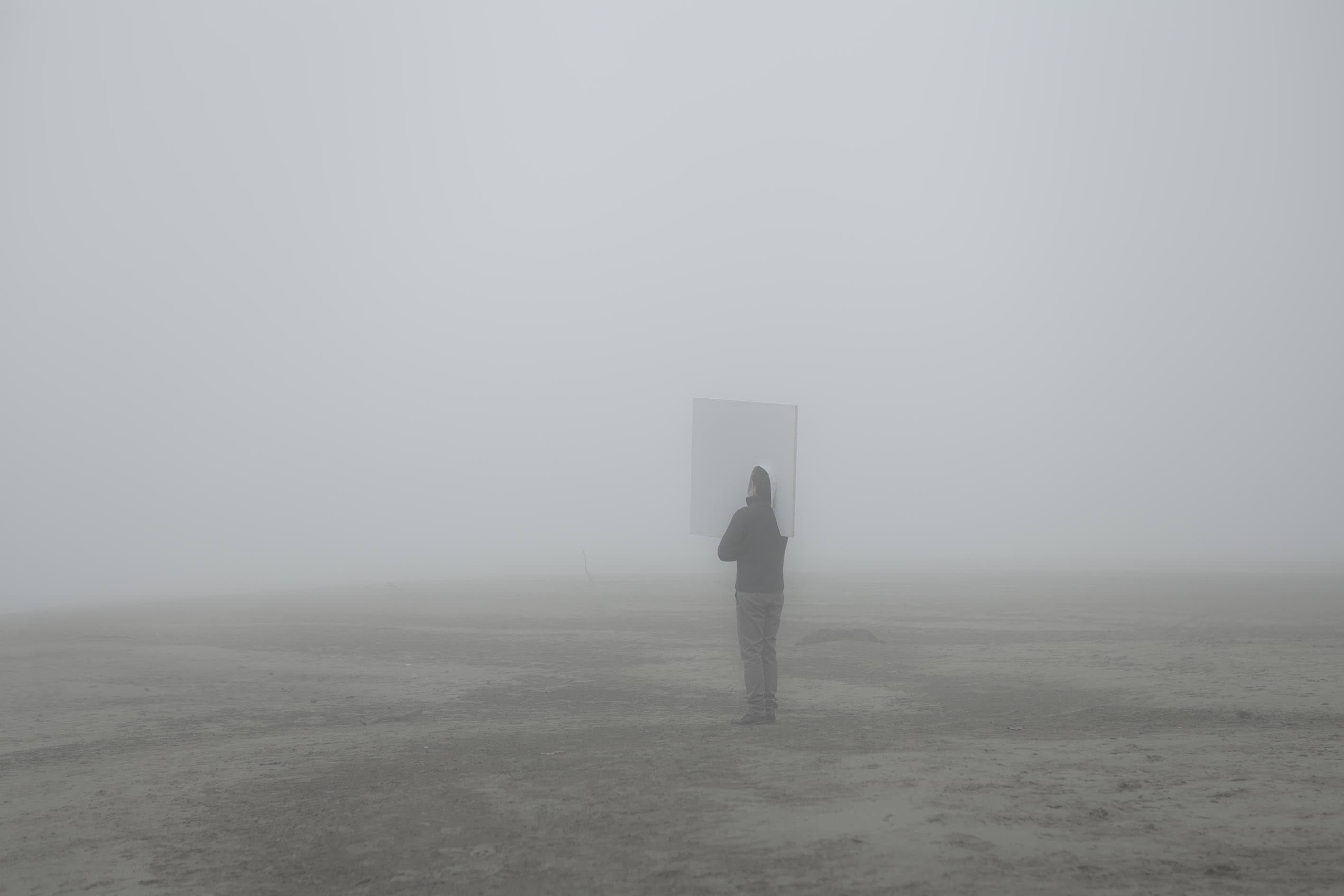 Durante la Prima Guerra Mondiale, quando non era stato ancora inventato il radar, erano stati messi a punto alcuni oggetti sperimentali nel tentativo di identificare le rotte degli aerei. Pedrini ne ha ricostruito uno e nelle tre fotografie intitolate Ascolto (2016) lo vediamo intento ad utilizzarlo in un paesaggio nebbioso che offusca la visuale. Questo dispositivo di ascolto sembra paradossalmente un quadro, fatto di tela bianca. Decontestualizzato dall’uso bellico, questo “quadro”, che nulla rappresenta, diventa mezzo di un atto performativo di confronto poetico con il paesaggio.
