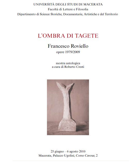Il Dipartimento di Scienze Storiche, Documentarie, Artistiche e del Territorio “Renzo Paci” della Facoltà di Lettere e Filosofia dell’Università degli Studi di Macerata dedica l’antologica L’ombra di Tagete allo scultore Francesco Roviello (Casagiove, 1956): una cinquantina di opere tra sculture, stele e disegni che ripercorrono il suo lavoro dal 1979 al 2009.