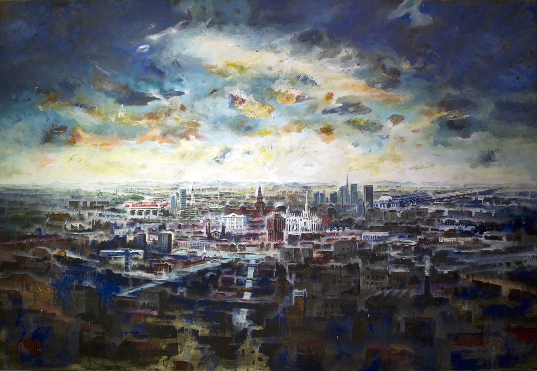 Francesco Santosuosso torna a concentrare la sua attenzione su questa Milano. Grandi tele, tavole, piccoli acquerelli su carta, inserti di giornali con simboli e caratteri di lingue e culture diverse, a raccontare di una città che si mette alla prova nel tentativo di