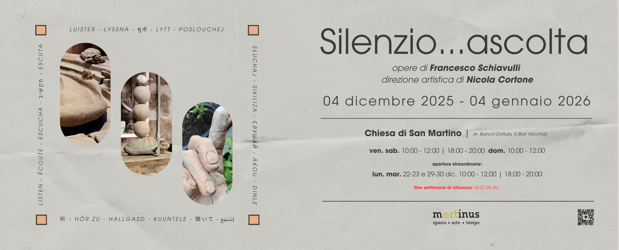 “Silenzio…ascolta” è l’evocativo titolo della mostra personale dell’artista barese Francesco Schiavulli, curata da Nicola Cortone e promossa dall’Aps Martinus, che sarà esposta nella millenaria chiesa di San Martino di Bari Vecchia (strada Bianchi Dottula 4) dal 4 dicembre 2025 al 4 gennaio 2026.