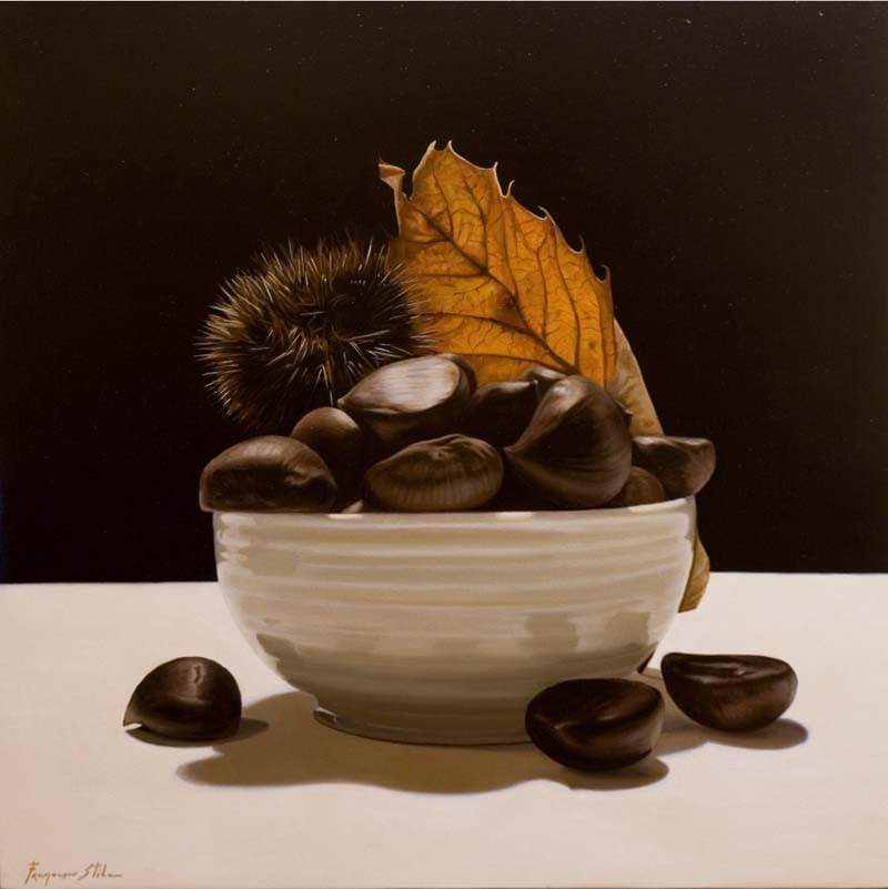 Non è questo il caso di Francesco Stile. Il suo pennello è, sì, preciso come un bisturi nel delineare le crepe che incidono la pelle sottile e friabile della cipolla, così come le irregolarità nella buccia polposa di un’arancia. Ma quel pennello non si ferma mai lì. Come un bisturi, appunto, penetra la realtà regalandoci un terzo occhio capace di guardare dentro alle cose, di udirne il respiro segreto, siano esse agrumi spaccati di cui si potrebbe giurare di avvertire il profumo persistente, o anche bicchieri, sulle cui curve cristalline la luce gioca come dita su una tastiera, creando una sinfonia di riflessi.