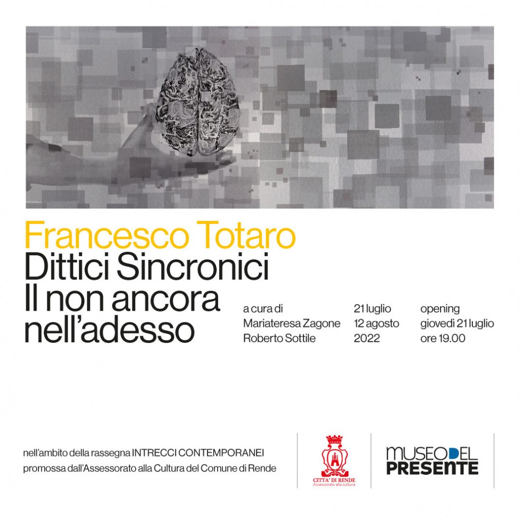 Giovedì 21 luglio 2022 alle ore 19.00 presso il Museo del Presente di Rende, all’interno della rassegna “Intrecci Contemporanei a cura di Roberto Sottile e promossa dall’Assessorato alla Cultura della Città di Rende, si inaugura la personale dell’Artista Francesco Totaro “Dittici Sincronici. Il non ancora nell’adesso”. Mostra a cura di Mariateresa Zagone e Roberto Sottile.