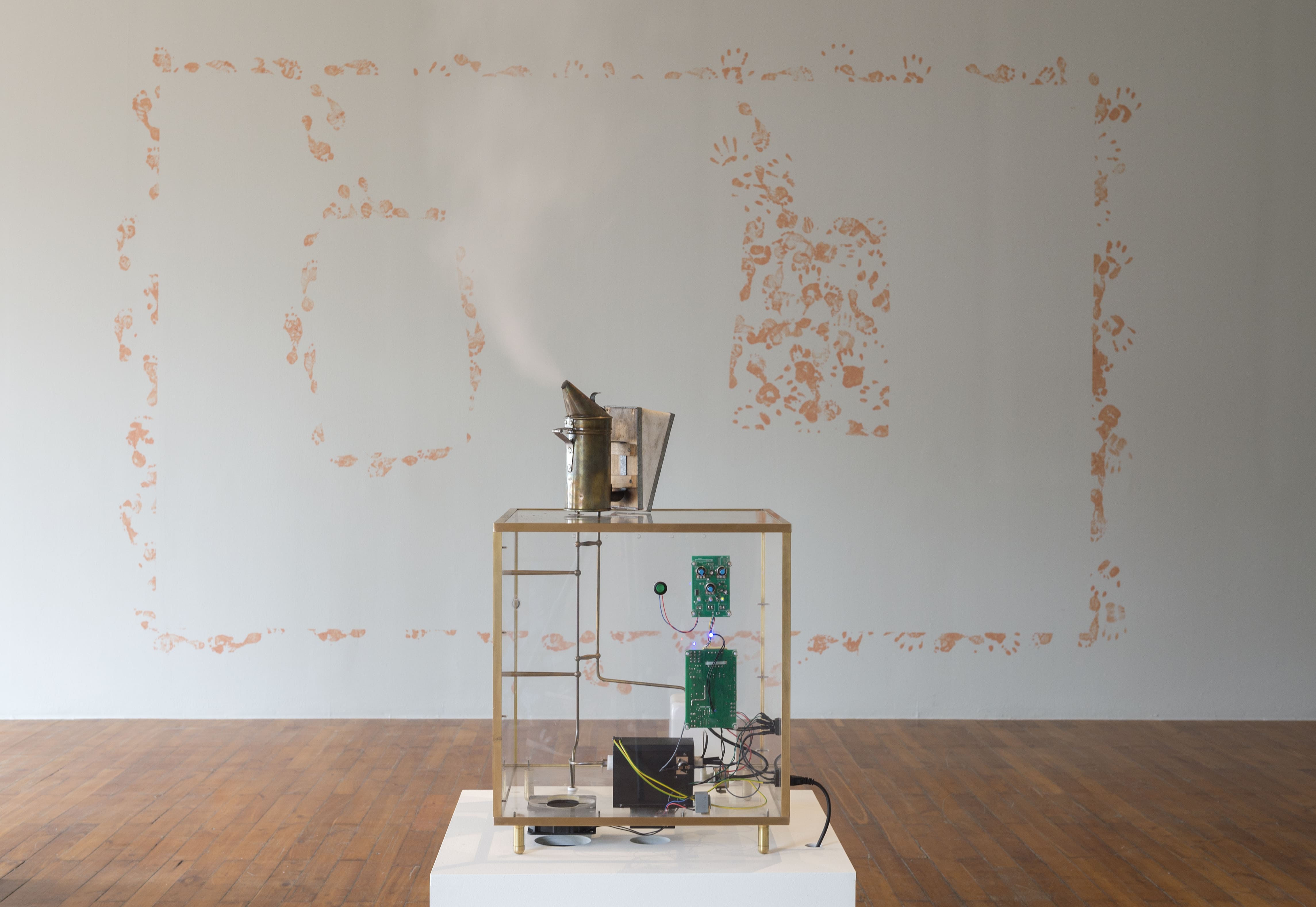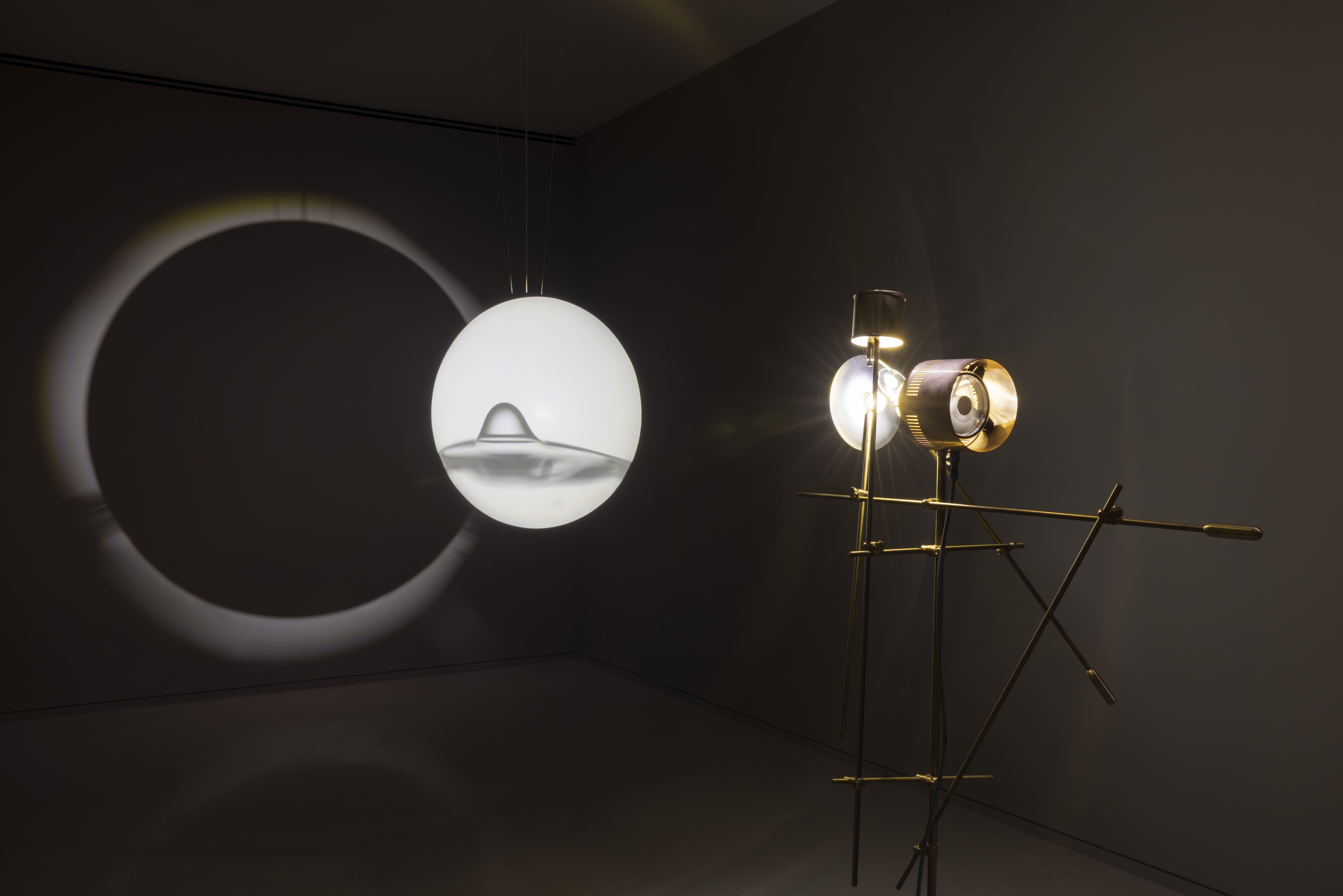 Proprio una delle lanterne, le opere che hanno fatto conoscere Tropa al pubblico italiano nella Biennale di Venezia del 2011, introduce la mostra. Si tratta di Lantern with clock mechanism (2025), in cui l’ombra proiettata in grandi dimensioni è quella di un meccanismo a orologeria in funzione. Come sempre nelle opere del ciclo, il proiettore non è un oggetto tecnico standard: disegnato dall’artista e realizzato artigianalmente in ottone, è una vera e propria scultura. Lo spettatore, attratto dapprima dal gioco di luci e ombre in movimento, si rivolge verso la sorgente luminosa e ne scopre l’essenziale eleganza, per poi tornare a concentrarsi sulla proiezione, in un movimento circolare.