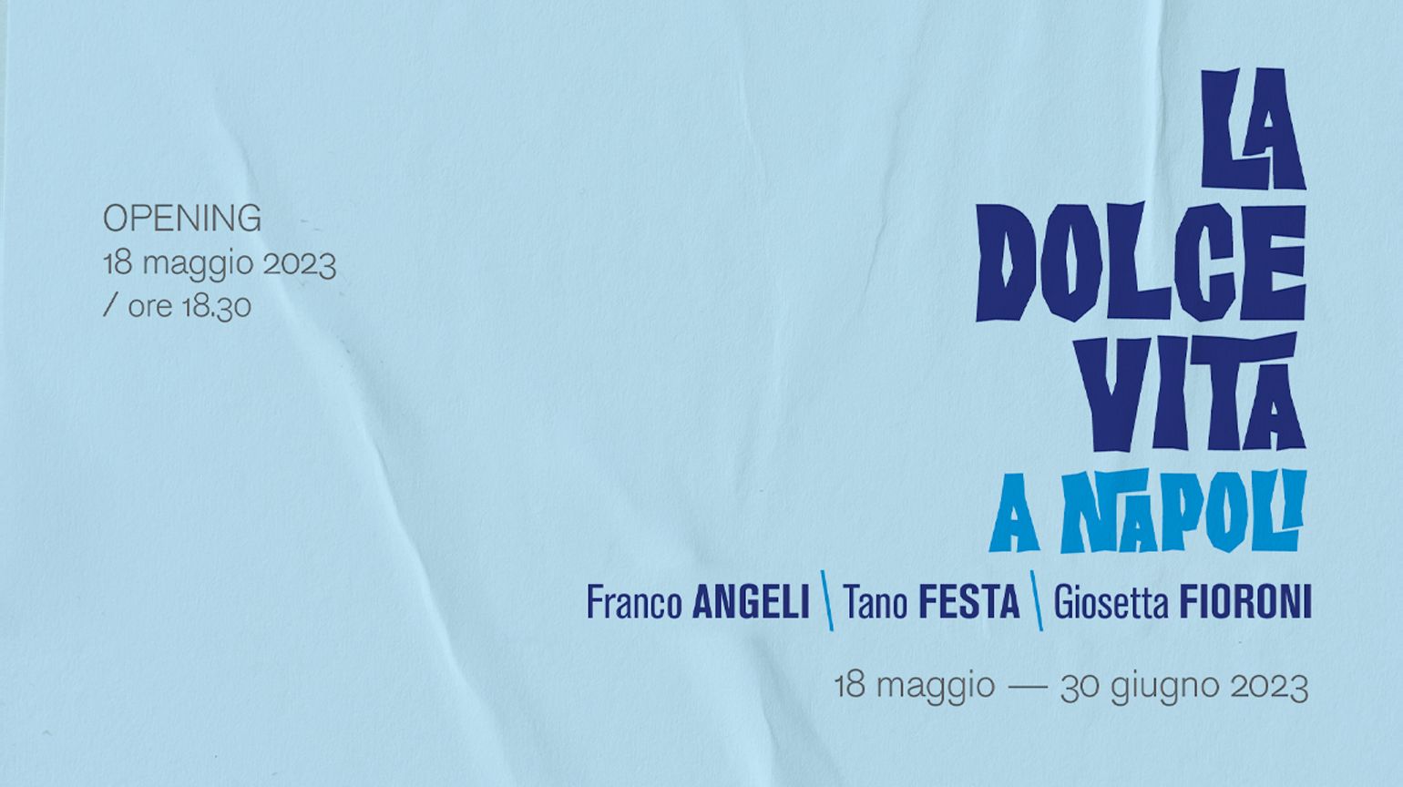 La Galleria Andrea Ingenito Contemporary Art è lieta di presentare la mostra collettiva “LA DOLCE VITA A NAPOLI. Franco Angeli | Tano Festa | Giosetta Fioroni” a cura di Andrea Ingenito, che si terrà dal 18 maggio al 30 giugno 2023 (opening 18 maggio ore 18:30).