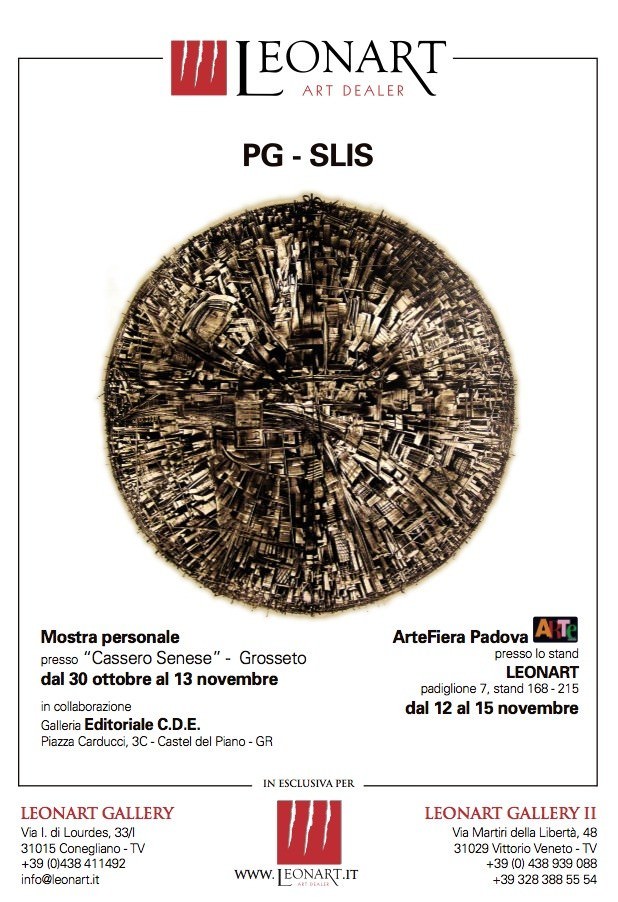 Dal Nordest alla maremma. Un filo color dell'arte unisce l'Italia. Dal 30 ottobre al 13 novembre al Cassero senese di Grosseto è allestita una “personale” di Pg Slis e Franco Anselmi, due delle personalità artistiche contemporanee più apprezzate in ambito internazionale. L'idea di riunire in un unico, suggestivo spazio due artisti di diverse generazioni ma uniti dalla stesa, straordinaria, vena artistica è venuta a Leonart gallery e alla Galleria editoriale C.D.E. Di Castel del piano (GR).