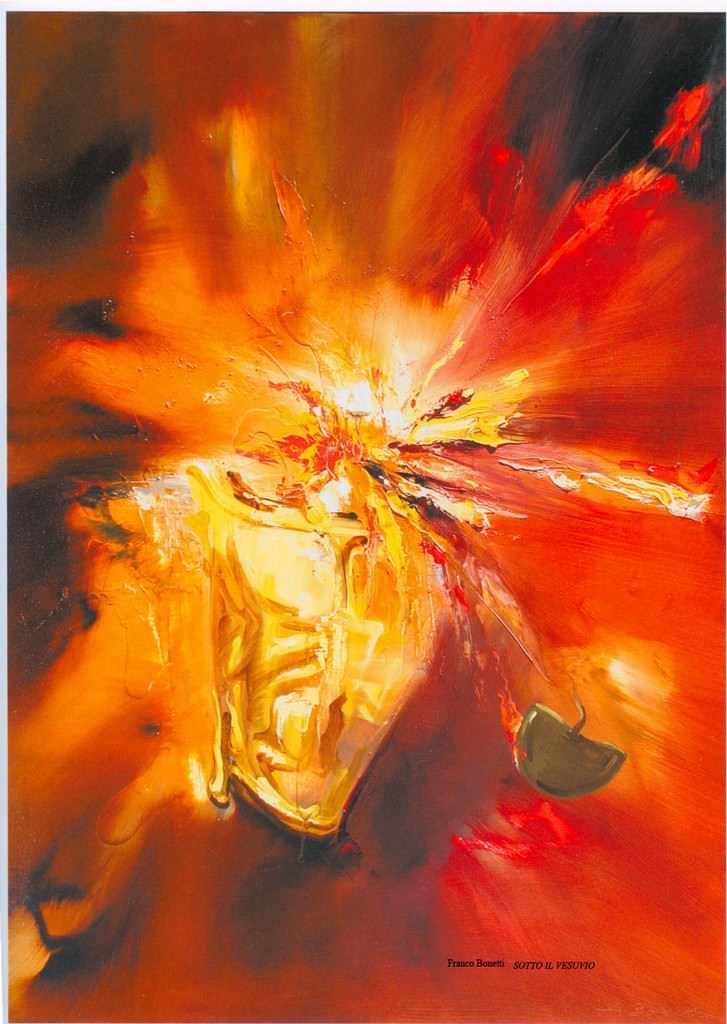 Così Mauro Giancaspro presenta l’artista ed illustra la mostra: “Franco Bonetti ha sempre avvertito un’attrazione irresistibile per il libro, per il suoaffascinante corpo fisico e per la palpitante anima che sembra celarsi tra le sue pagine: un prodigioso insieme che diventa infallibile strumento di conservazione e ditrasmissione nel tempo della memoria scritta dell’uomo, con tutta la carica esplosiva di informazioni, di messaggi, di libertà, che la lettura accende.” […] “…Bonetti sembra, infatti,seguire e spiare l’evoluzione della natura per accogliernel’energia creatrice mentre i processi di nascita sono ancora in via di definizione, per sorprenderli, catturarli e trasferirli sulla tela, aspettando, quasi che sulla superficie si completi il processo di costituzione di un corpo o di una forma: Bonetti ci appare comeun moderno Prometeo che artiglia prodigiosamente con le mani globi infuocati per lasciarli raffreddare; sulle sue tele questi indistinti nuclei primordiali bruciano disegnando figure incandescenti, distendono o contraggono il magma di cui sonocomposti, fanno esplodere i gas di cui sono gonfi proiettando centrifugatamene scintilleluminose, si coagulano, infine in concrezioni iridescenti, agglutinando con forza di attrazione centripeta nuclei cromatici.” […] “… Due letture, non sappiamo quanto recenti o quanto remote e a lungo digerite, gli hanno rinsaldato l’indole vulcanica e lo ora portano a percorrere da vicino la natura e la storia, le paure e le superstizioni, i sortilegi e le preghiere, caratteristiche di una terra che, stretta trai Campi Flegrei e il Vesuvio, è sempre stata segnata da una caduca instabilità, nella quale le più irresistibili fonti d’attrazione sono sempre state anche lepiù temute cagioni d’allarme. a percorrerla e rappresentarla con quegli strumenti incandescenti e magmatici di espressione suoi propri che solo adesso sembrano trovare un’inconsapevole immaginata scaturigine: si tratta . secondo la confessionedello stesso artista, de il Satyricon di Petronio e La Pelle di Curzio Malaparte, che in un’immaginifica fusione dei rispettivi titoli danno nome a questa mostra” […]
