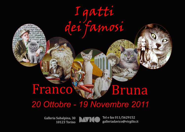 Nella personale che Franco Bruna, a due anni di distanza dalla sua precedente mostra, propone alla galleria Davico, l'artista ha concentrato la sua fantasia creativa sul rapporto "gatti/personaggi famosi" e ha costruito una galleria di ritratti dove si fa fatica a stabilire chi sia il protagonista dell'opera: a nostro avviso vi è un sostanziale equilibrio fra i "Famosi" magistralmente interpretati dal pennello di Bruna ed i "Gatti"che spesso conquistano la scena, affiancando da protagonisti principali i grandi scrittori, letterati, pittori, scienziati.