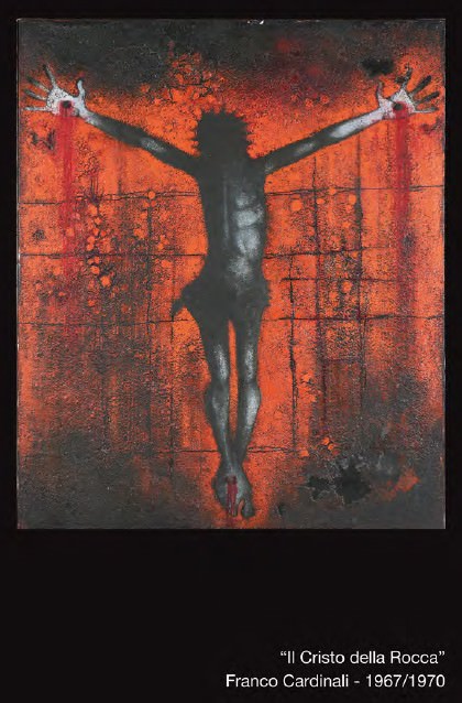 Il Cristo della Rocca è un’opera dall’intenso significato metafisico, a lungo maturata nella mente e nell’animo dell’autore, che le diede forma e colore inventando appositamente una tecnica del tutto nuova ed originale. L’uso della proteina del latte combinata alla sabbia esprime in Cardinali una esperienza mistica, un profondo legame con la terra, con il messaggio francescano della Verna, con il senso del tempo e della vita. Il soggetto poi, un Cristo senza croce, sospeso in un cosmo di materia e luce, invita l’osservatore ad una riflessione profonda e ad una esperienza visiva di grande impatto.