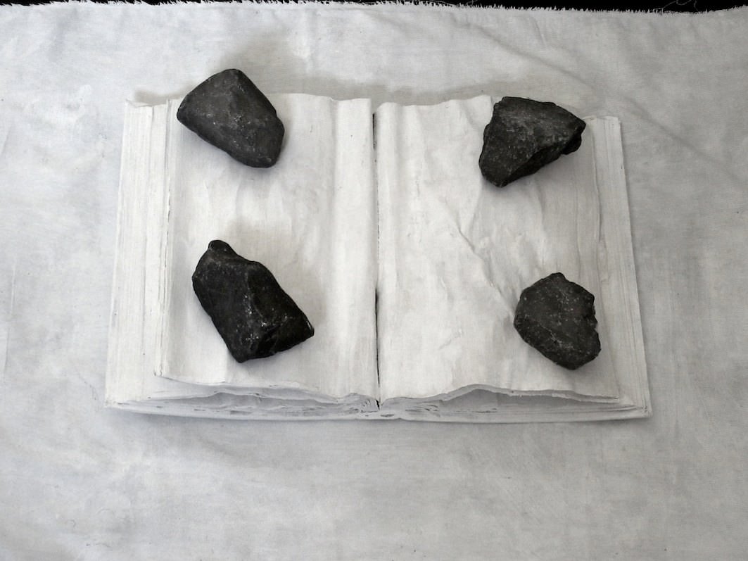 […] Sono fotografie della nuda evidenza delle cose al loro stato di sospensione del senso. “Sudari plastici” e “segni della terra”, un alfabeto di pietre e scaglie di vetro (materie prossime, “fraterne”: il vetro ha origine dal fuoco che fonde la pietra) e linguaggio filosofico che nel video si sfoca e si trasforma, si fonde, si dissolve… lasciando alla luce e all’ombra i segni dell’inconoscibile e del mistero […] La “Biblioteca catafisica” è un palinsesto di immagini dell’assenza, una “kenosi” del linguaggio che sospende la traccia materica della scrittura nell’ indicibile e nell’in-figurabile, forse nell’inimmaginabile. Del senso delle cose e delle loro forme non vi è che riflesso nelle materie originarie della terra, pietre, fuoco, luce, rami… Il mondo è sospeso nelle pagine bianche del Librum, tra le pieghe, le ferite, le lacerazioni, le stratificazioni, i frammenti che “parlano” nel silenzio dell’immagine interrogando lo “sguardo noetico” sul tempo e lo spazio del linguaggio prima del e oltre il linguaggio medesimo, nel vuoto grembo del pensiero[…]