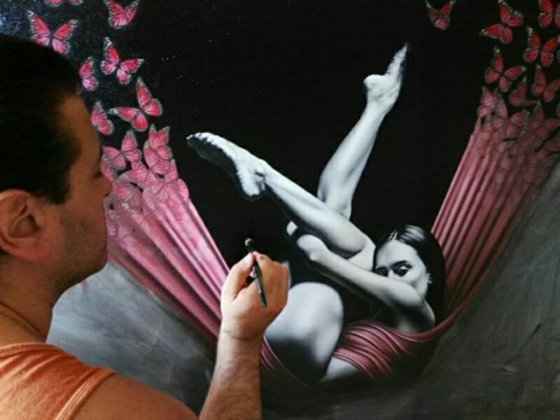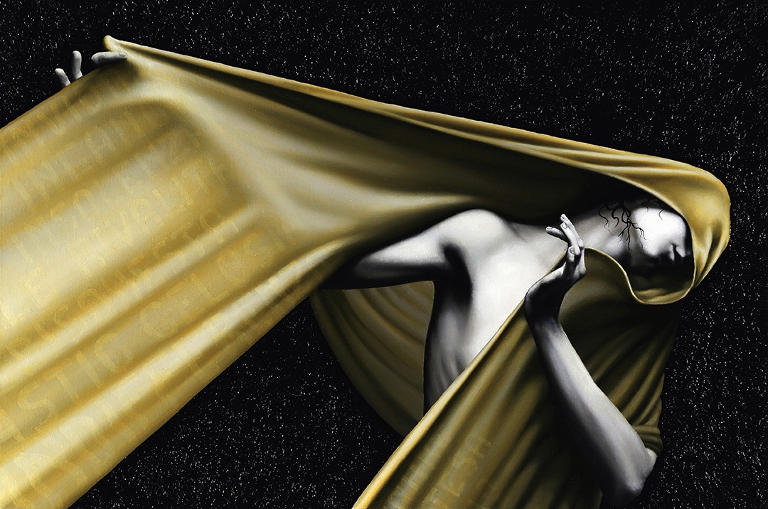 Franco Cisternino è un pittore che predilige i soggetti femminili e la dinamicità delle forme grazie all’unione di un telo che fluttua nello sfondo omogeneo e copre, quasi danzando, le figure femminili in bianco e nero.