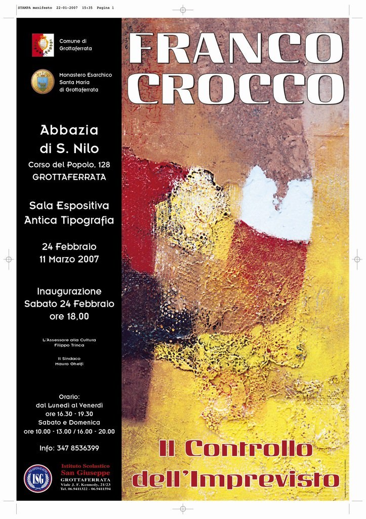 Si inaugura sabato 24 febbraio 2007, alle ore 18.00, presso la Sala dell’Antica Tipografia dell’Abbazia di S. Nilo in Grottaferrata (Roma) la mostra “Il controllo dell’imprevisto” del pittore e incisore Franco Crocco