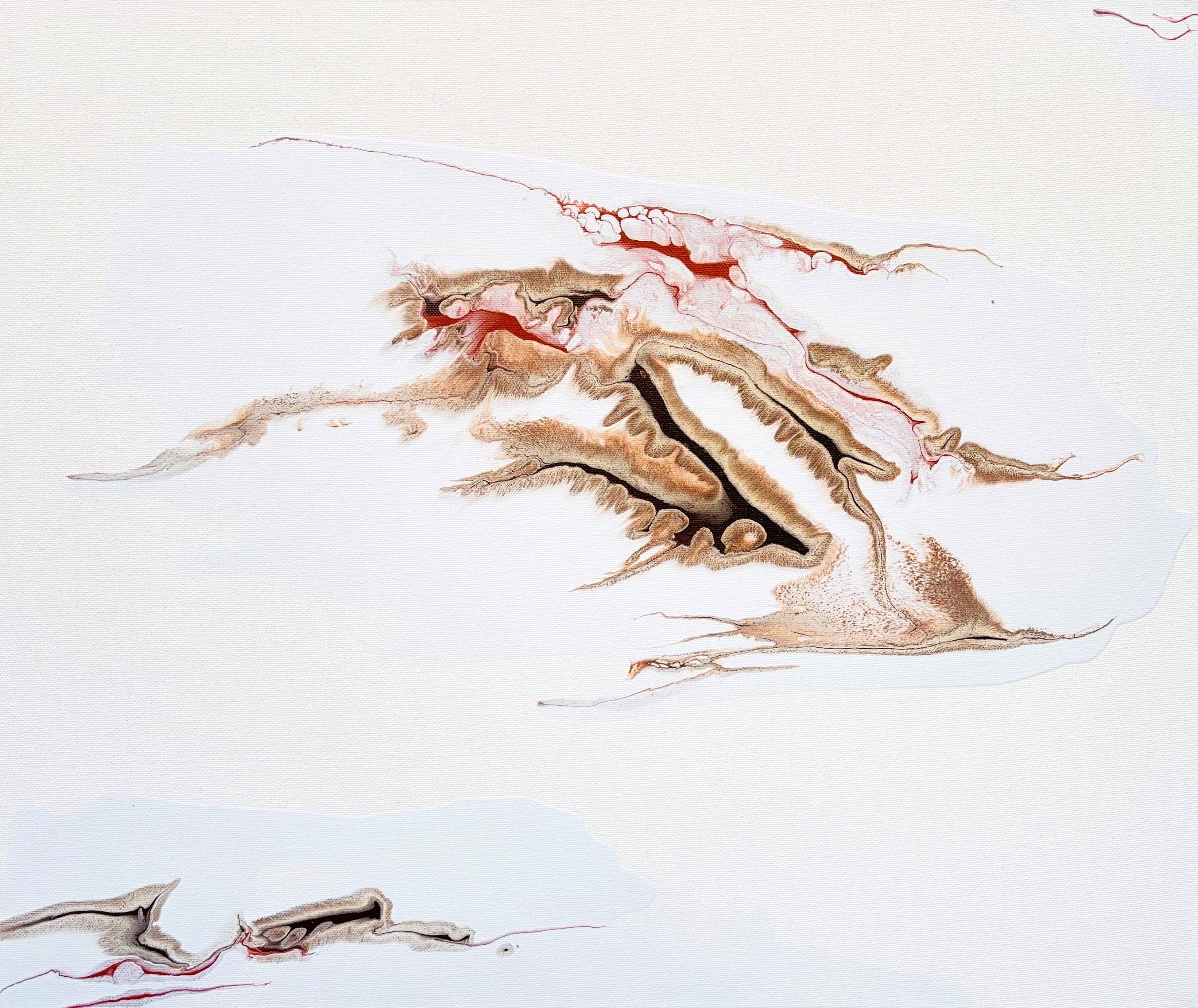 Con la serie “Recondite Realtà”, Franco Dallegri compie un’evoluzione fondamentale rispetto alle premesse consolidate nel 2025 con il ciclo "Un altrove oltre il visibile". Se in quella fase era già acquisita la capacità della materia di attivarsi e generare forme, qui l'indagine si sposta prepotentemente sul problema dello "spazio pittorico", inteso non come proiezione di ultra-mondi fantastici o dimensioni naturalistiche, ma come piano fisico su cui accade qualcosa di reale in sé stesso. La superficie della tela cessa di essere un supporto inerte per farsi teatro di "immagini-evento": manifestazioni autonome del magma informe della materia pittorica che, versata sulla superficie di fondo e attivata senza uso di pennello, trova, citando le stesse parole dell’artista, «le condizioni per scrivere l'alba della sua vita» in modo indipendente e de-personalizzato.