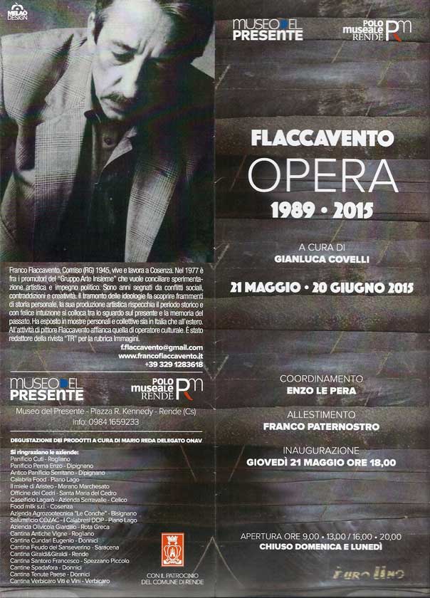 Al MUSEO DEL PRESENTE, giovedì 21 Maggio alle ore 18,00, vernissage “OPERA” Mostra Antologica del maestro Franco Flaccavento, presentata nelle rinnovate gallerie del museo aggiornate secondo i più innovativi parametri museografici, sotto il Patrocinio dell’Assessorato alla Cultura del Comune di Rende, a cura di Gianluca Covelli, allestimento di Franco Paternostro. La mostra si concluderà, con un finissage dedicato all’artista, sabato 20 giugno 2015.