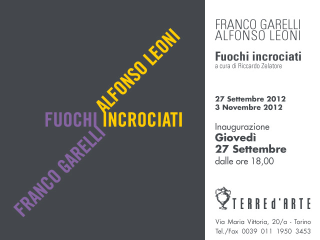 Due generazioni a dialogo, due anime inquiete sulla medesima lunghezza d’onda, due genialità a contatto. Il pretesto della mostra Fuochi incrociati, ordinata da Riccardo Zelatore, che inaugura a Torino presso la Galleria Terre d’Arte il 27 Settembre 2012, è uno scambio epistolare tra i due artisti che risale al 1967 in occasione del Premio Gubbio. Franco Garelli (1909-1973) è allora membro di giuria e Alfonso Leoni (1941-1980) compare tra i partecipanti. L’occasione segna l’inizio di un’amicizia ma soprattutto è l’incontro di due sensibilità affini che, per onestà intellettuale di entrambi, non celano reciproca stima e ammirazione. Per Leoni non è solo educata deferenza per un maestro già maturo e affermato; per Garelli non è benevolenza per un talento evidente. Il loro rapporto, pur di breve respiro, considerato che Garelli scompare nel 1973 e purtroppo Leoni giovanissimo solo pochi anni dopo nel 1980, resta un felice incontro di eccellenze, un raro connubio d’intelletto. I due uomini sono eppure diversi, per formazione e per percorso espressivo, ma forte è il legame mediato dal mezzo espressivo che più hanno amato e frequentato: la terracotta. In mostra una quindicina di sculture dei due artisti che appartengono al periodo che va dagli anni cinquanta ai primi anni settanta e che vogliono suggerire, in modo misurato ma significativo, quanto il modellare e il plasmare la creta fosse per i due soffio vitale. Non si è cercato come criterio ordinatore la completezza dei reciproci percorsi, quanto l’individuazione – pur soggettiva - di alcuni punti di contatto materico, cromatico e anche tattile che confermano quanto l’essenza e la preziosità di questa affascinante e complicata materia possa unire chi si pone come obiettivo di adoperarne le possibilità intrinseche per tentarne nuove espressività.