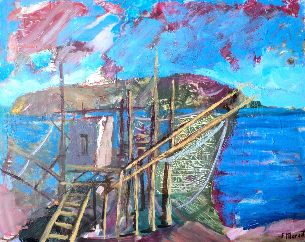 I quadri di questa mostra si squadernano allo sguardo del visitatore come gli appunti di viaggio di un esploratore del Gargano, rapidi e guizzanti schizzi presi durante lunghe passeggiate tra macchie mediterranee, rocce, scorci marini: una roccia della montagna o uno scoglio sul mare, un trabucco nella tempesta o uno scorcio di paese pugliese.