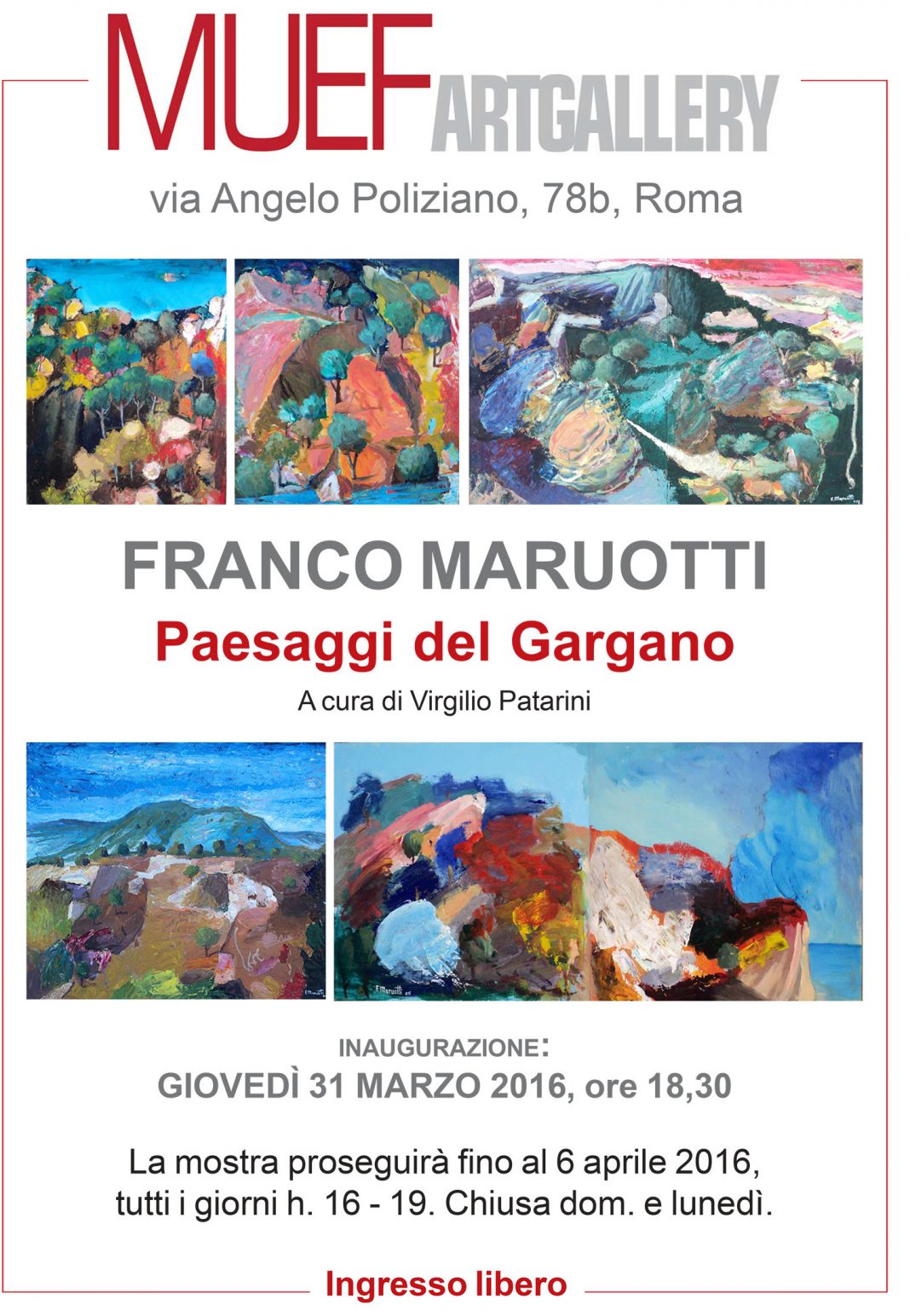 Si inaugura giovedì 31 marzo 2016 alle ore 18,30 alla Muef Art Gallery di Roma, via Poliziano, 78b la mostra personale di pittura di Franco Maruotti intitolata “Paesaggi del Gargano”, a cura di Virgilio Patarini con la collaborazione di Roberta Sole e organizzata da Zamenhof Art di Milano.