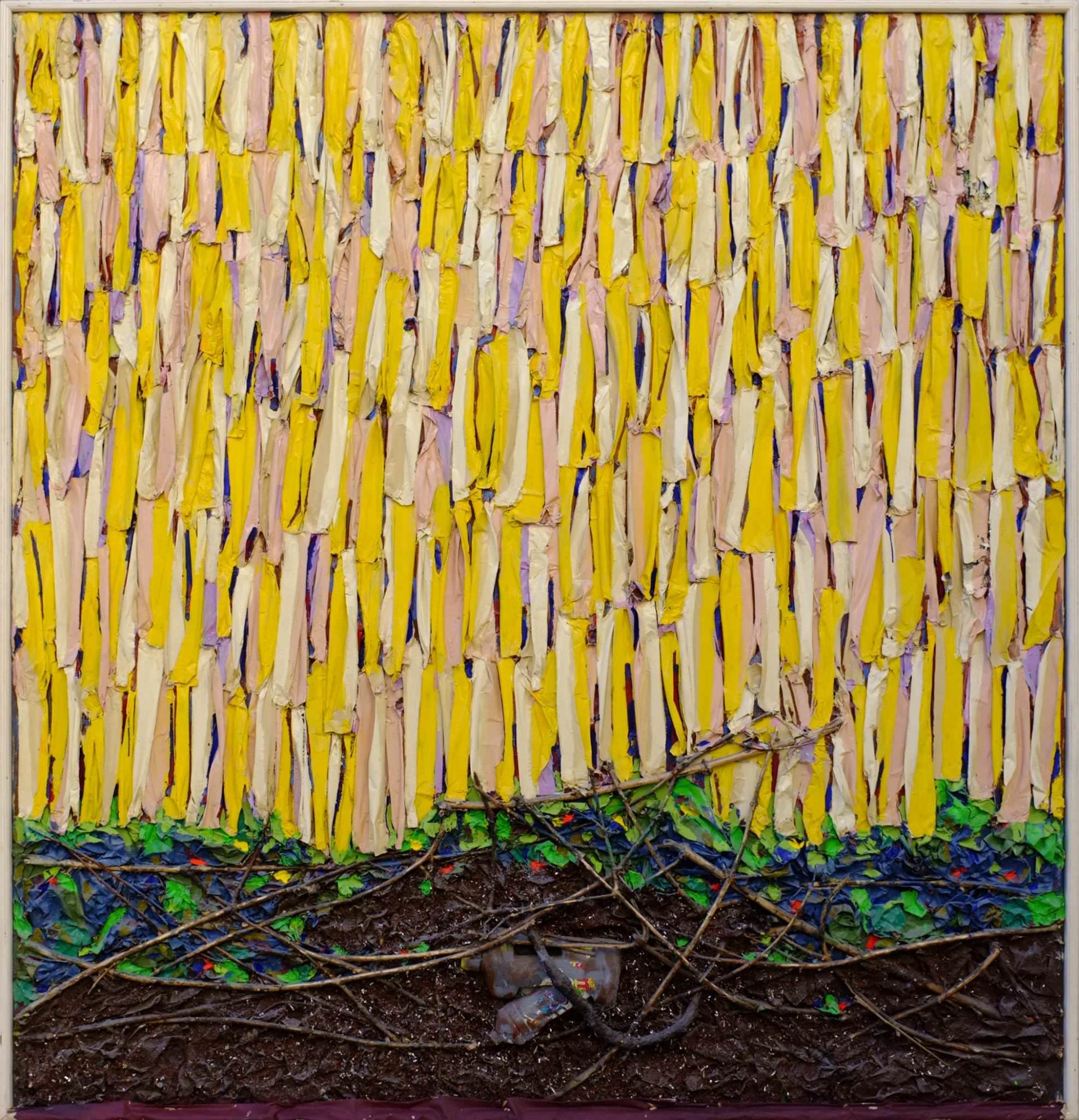 In “tutto è distrutto” Pulacini non si limita a dare forma ad un'estetica del rottame, dello scarto ma vuole rendere visibile un'intensa quanto silenziosa denuncia del progressivo e inesorabile avvelenamento della natura e un accorato appello per un suo più intimo sentire. Natura non come altro da noi semplicemente da difendere, da tutelare ma come quel noi che noi stessi siamo e di cui è vitale avere cura. In quest'opera vediamo in azione tutta la carica inventiva e la potenza espressiva dell'autore. L'uso accorto di materiali poveri(qui i rami si intrecciano a plastica, foglie, carta e scarti di fonderia), riprende a distanza e in modo nuovo le sue composizioni trash della fine degli anni '70, sovrastato da una composizione di brandelli verticali gialli, rosa e bianchi azzurrati che interpretano la natura in forma astratta e concettuale.