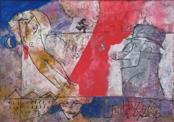 Franco Rognoni nasce a Milano il 20 settembre 1913 da Giuseppe e Giuseppina Carabelli in una famiglia della piccola borghesia. Giovanissimo inizia a interessarsi del disegno e della pittura e, adolescente, frequenta le scuole tecniche di tessitura e quindi la Scuola superiore d’Arte applicata del Castello Sforzesco. Il critico Raffaello Giolli è il suo primo sostenitore, un importante riferimento culturale che consente a Rognoni di aprire nuovi orizzonti. Fin dal 1934 collabora come disegnatore a importanti riviste e quotidiani mentre nel ’38 espone per la prima volta. La sua formazione è influenzata da artisti come Sironi, de Pisis, Modigliani mentre la passione per i libri lo avvicina alle soluzioni grafiche e pittoriche dell’Espressionismo tedesco. Luino, sul Lago Maggiore, lo accoglie durante la guerra e qui si concentra sulla sua produzione che si arricchisce di incisioni, illustrazioni, mantenendo così un’importante collaborazione con molti periodici e dei contatti fondamentali con gli editori ed i collezionisti. Nel primo dopoguerra torna a Milano e nel 1946 sposa Mariuccia Noè, con la quale condividerà per tutta la vita significativi interessi culturali. Nello studio di Lambrate nascono nuovi disegni e dipinti che hanno già in sé le tematiche fondamentali dell’artista. In particolare egli sviluppa un personalissimo linguaggio antiaccademico. Guido Ballo lo presenta a Milano nel 1953, in una personale che apre nuovi interessi nella critica. Quattro anni dopo la Rai gli propone un progetto di scenografo-costumista e la stessa attività viene svolta per la Piccola Scala e La Fenice di Venezia. Il pubblico e la critica apprezzano l’originalità di interpretazione degli spazi teatrali, aspetti che confluiscono nella pittura tramite l’utilizzo di una commistione tra decorazione, illustrazione, grafica e scenografia. Una contaminazione che si riflette anche nella mescolanza di ironia e dramma, con un gusto che non è azzardato definire musicale. E anche le amicizie dell’artista abbracciano soprattutto l’ambito letterario e musicale: Riccardo Malipiero, Vittorio Sereni, Piero Chiara, Dante Isella. Gli anni Cinquanta sono contraddistinti dal legame in esclusiva con la Galleria dell’Annunciata di Milano e con le mostre organizzate in tutta Europa. Il decennio successivo lo vede impegnato in numerose esposizioni e nell’attività editoriale mentre quattro grandi teleri dedicati ad Ulisse sono realizzati per la turbonave Michelangelo. Tra gli anni Settanta e Ottanta la sua attenzione si sposta sulla figura umana, vista con connotazioni critiche e scettiche, e sulla città, rappresentata sempre più come contesto straniante. Accanto a questa connotazione appare un aspetto sognante, legato alla memoria. Il lago, altro luogo privilegiato della sua rappresentazione e della sua esistenza che si alterna tra Milano e Luino, esalta questa dimensione pittorica che fissa dei protagonisti sospesi tra realtà e immaginazione. L’ultimo decennio, gli anni Novanta, vedono l’artista impegnato nella rappresentazione della vitalità. Ampio spazio è quindi dedicato alla cromia, in una direzione pittorica che diventa sempre più mitteleuropea, nel segno del Simbolismo e dell’Espressionismo. L’artista è scomparso a Milano l’11 marzo 1999.