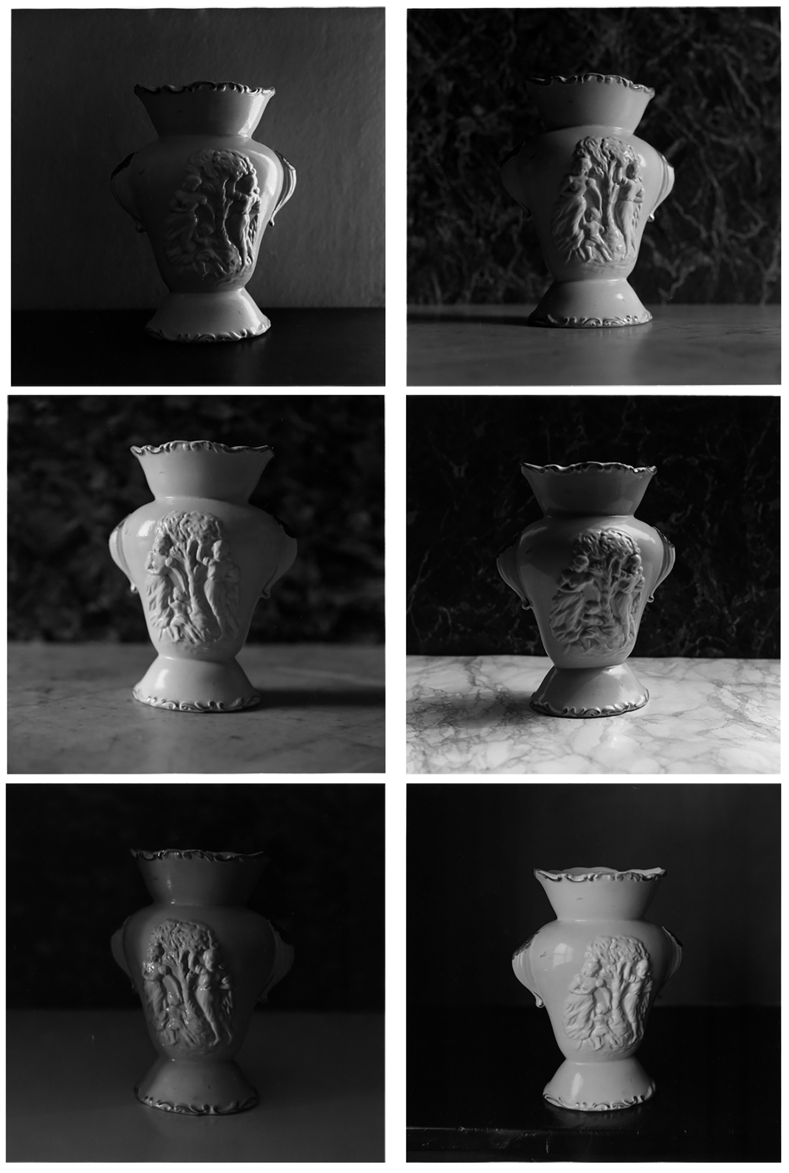 Nella sede di via Stradella 7 sono presentati capolavori degli anni Settanta come i famosi 36 scatti di Senza titolo (Bottiglie d’acqua minerale), 1975, i pattern minimali di Senza titolo (Piastrelle), 1975 e Senza titolo (Parquet), 1977, gli spazi in attesa di Senza titolo (Tele), 1976: tutte quelle opere in cui più radicalmente si fa da parte la presenza ingombrante dell’Io. Ma lo spazio include anche lavori meno noti come la serie di otto fotografie Senza titolo (Latte) del 1978 in cui uno stesso cartone di latte si staglia, attraverso movimenti di piano impercettibili, contro uno sfondo marmorizzato, immobile, statuario. Se gli spazi espositivi di via Stradella 4 sono dedicati alla produzione degli anni Ottanta con un’attenzione più marcata agli scarti del formato — i tondi di Senza titolo (Brocca) del 1980–81 — alle variazioni della luce e dell’inquadratura (anche se è stato escluso dalla mostra l’intero ciclo e leggendario della Zuppiera); così l’ultima sede di via Stradella 1 raccoglie le opera degli anni Novanta cercando di restituire una galassia pulsante di immagini che, a partire da layout grafici dello stesso Vimercati, appaiono nitide e si sfocano, si allargano e si restringono, si fanno più luminose oppure scompaiono nel buio.