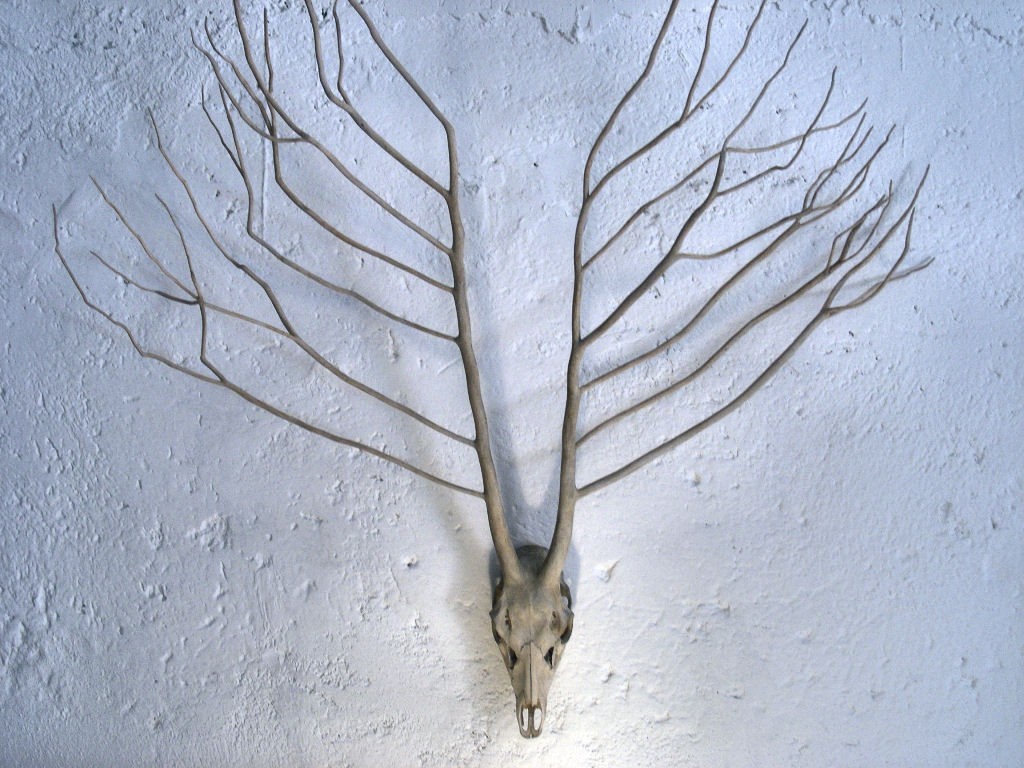 Il visitatore verrà accolto da un’installazione di grande impatto, collocata al centro della Malga, e da una serie di opere di più piccole dimensioni che ricordano i trofei di caccia che troneggiano in molte case del Trentino. Le opere sono costituite da una parte animale, il teschio, e una vegetale, fatta di rami “modellati” a formare il palco delle corna. Questa diversa commistione di “materiali” si annulla quasi completamente agli occhi dell’osservatore, che con difficoltà riesce a percepire l’intervento dell’artista. La mostra Vegetaniamal esplora con approccio poetico e immaginifico le analogie rami/arti, tronco/spina dorsale, corteccia/pelle, radici/corna, linfa/sangue, proponendo una riflessione personale e partecipata sulle relazioni fra la condizione degli esseri viventi e della natura. La scelta di presentare il progetto nel particolare contesto di Arte Sella non è quindi casuale.