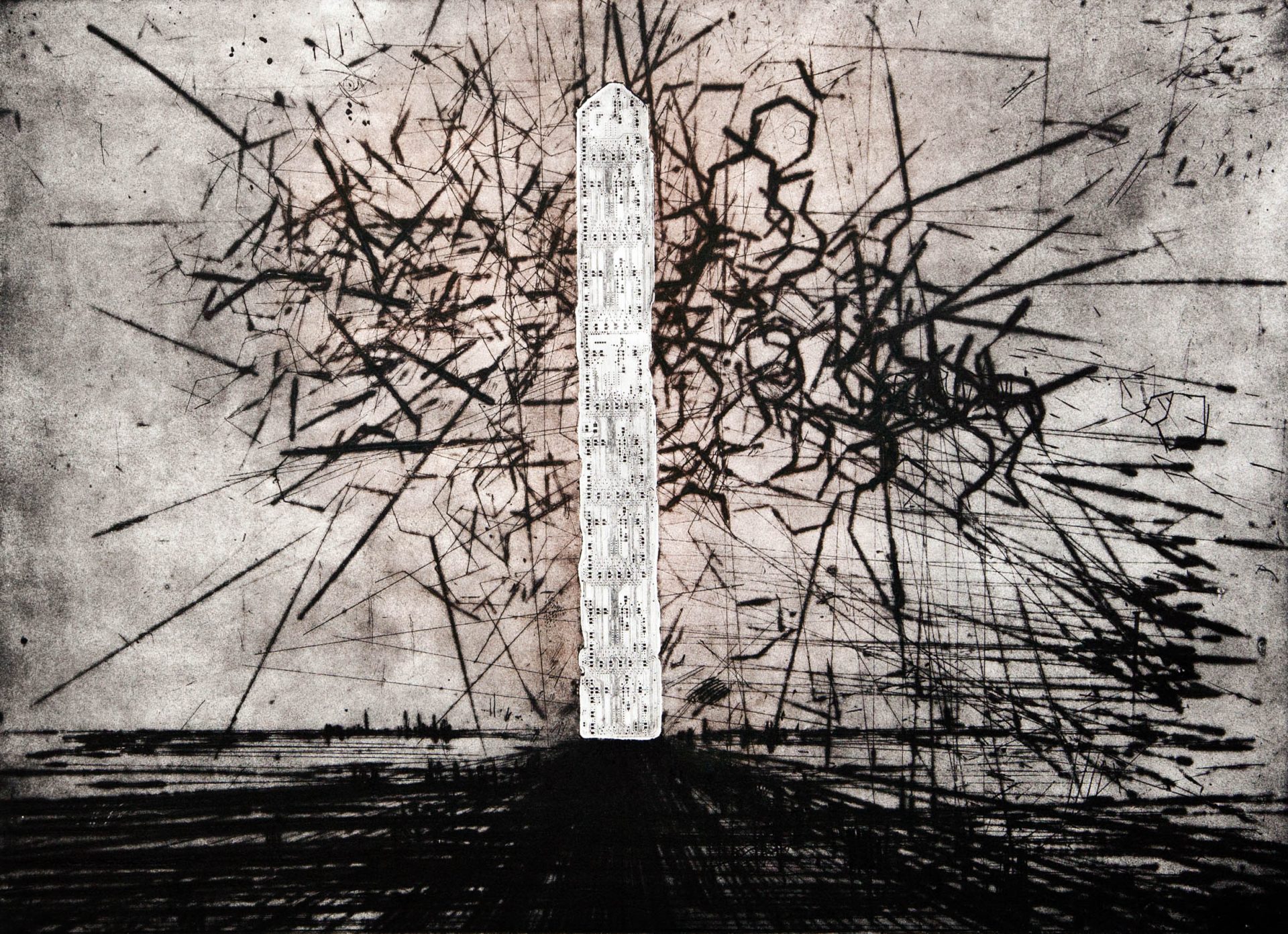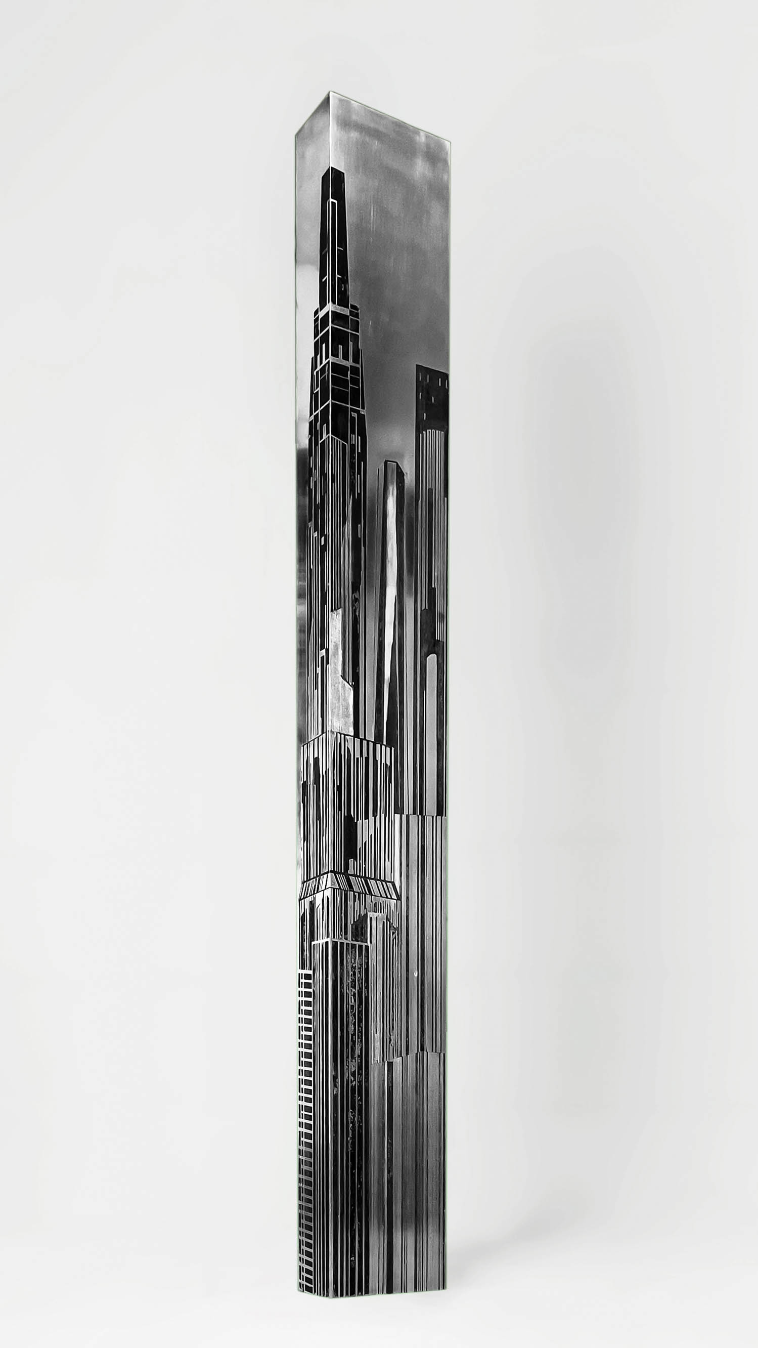 Le opere di Martinangeli, incisore e scultore, aprono varchi verso città che non esistono eppure ci appartengono. Metropoli immaginarie, costruite con il rigore del segno inciso e la forza del metallo, città di architetture fredde e solenni, ma che si ergono come organismi viventi e obbligano lo spettatore a confrontarsi con lo smarrimento delle strade e delle piazze che ogni giorno attraversiamo, senza viverle. Sono paesaggi di un’inquietante familiarità, spezzati da non-luoghi che non sappiamo riconoscere, e così sanno parlare del nostro abitare, delle fughe e delle assenze di una vita urbana che ci disegna senza che ne conserviamo coscienza. Le grafiche, con le loro prospettive taglienti, e le sculture, metalli incisi che si accendono di luce, diventano presenze silenziose e abbaglianti: corpi muti che custodiscono un segreto, testimoni di un degrado che ci piace pensare solo al di fuori di noi, come se negassimo alla città l’osmosi che ci plasma. Così si rivela il fragile equilibrio tra paesaggio urbano e paesaggio interiore. L’occhio si perde tra linee e riflessi, la città, organismo inquieto, ci trascina nelle sue metamorfosi, ci guida a reinventare lo sguardo, l’identità, la memoria e allora, lentamente, nella tensione silenziosa delle forme, si anima. Ogni opera diviene specchio di questo continuo processo, restituendoci l’immagine della nostra stessa precarietà: parte di un organismo grande e possente, ma non meno fragile della nostra identità.