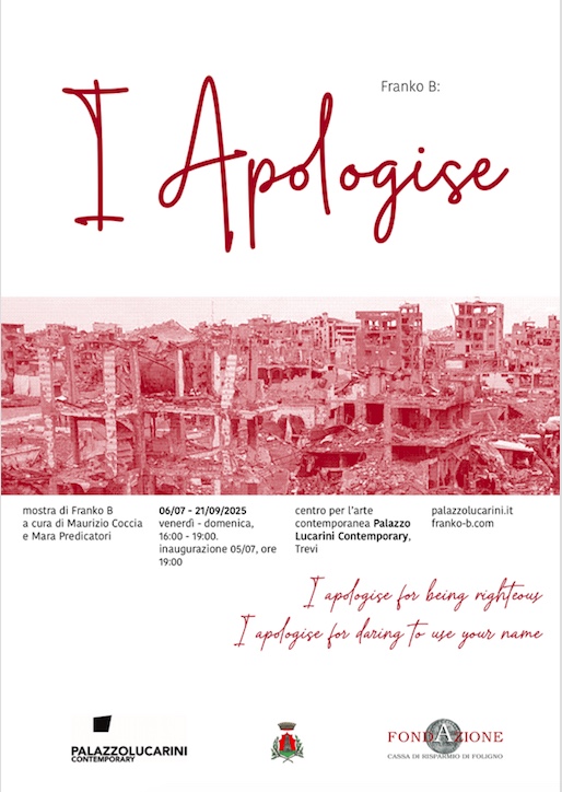 Sabato 5 luglio, dalle 19:00, aprirà a Palazzo Lucarini Contemporary I APOLOGISE, una nuova mostra personale di Franko B, tra le figure più radicali e riconoscibili dell’arte contemporanea internazionale, a cura di Maurizio Coccia e Mara Predicatori.
