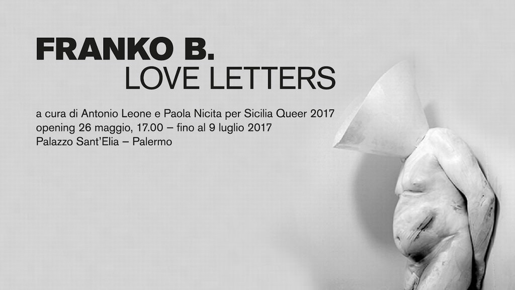 All'interno della programmazione del Sicilia Queer Film Fest 2017, Love Letters è la mostra di arti visive dedicata al performer e artista Franko B., tra i maestri internazionalmente riconosciuti della Body Art, curata da Antonio Leone e Paola Nicita, realizzata in coproduzione con Fondazione Sant'Elia e con il sostegno della Galleria Pack di Milano, che si inaugura venerdì 26 maggio alle 17 alla presenza dell’artista, al piano nobile di Palazzo Sant’Elia, in via Maqueda 81 a Palermo.