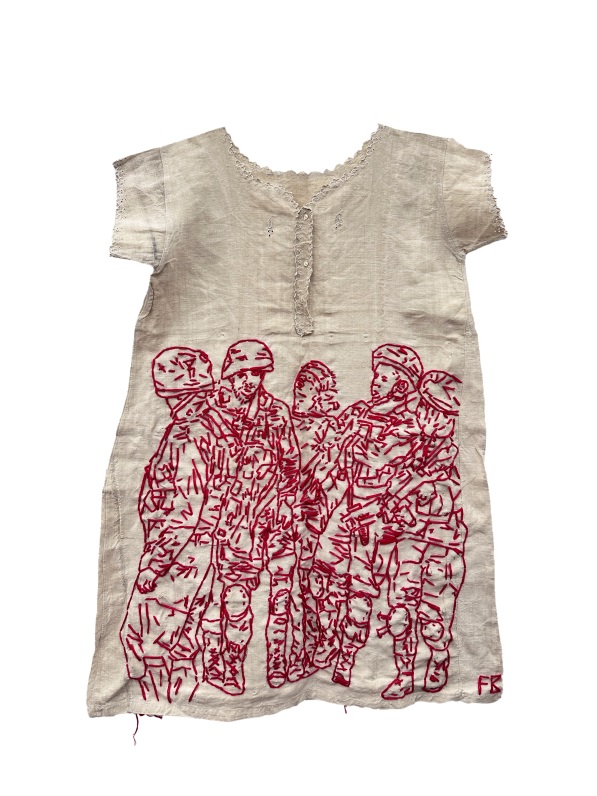 Il dramma della violenza e dei conflitti viene approcciato attraverso immagini o idee tratte dalla cronaca mediatica, ricamate su vecchie vesti da camera o tuniche bianche: bambini-soldato, guerriglieri armati, corpi feriti o anche controversi e contraddittori momenti di intimità, oppure brevi moniti scritti evocano la difficile realtà dei nostri giorni, spesso rimossa o diluita nella retorica di regime.