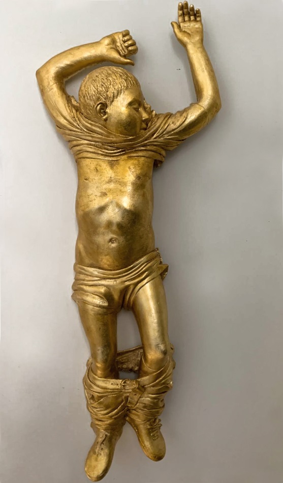 Nella parete centrale, al fondo della sala, spicca, solitaria, una scultura che riproduce il corpo di un bambino interamente ricoperto d’oro, che giace abbandonato, esanime, con i pantaloni calati sotto il ginocchio: può essere la vittima di un bombardamento, ma anche un migrante che non ha retto le difficoltà della traversata, o ancora la vittima di un abuso violento coperto dalle ipocrisie della benpensante società borghese, ma poco importa. Ciò che conta è puntare il dito sul fatto che viviamo in un contesto in cui l’infanzia si trova continuamente esposta alle offese di un’organizzazione fondata sul cinismo e sulla cristallizzazione dei privilegi dell’economia di classe.