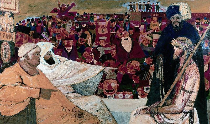 Si apre a Milano una mostra antologica dedicata a Franz Borghese, l’artista romano scomparso prematuramente quattro anni fa. Sono una trentina le opere esposte, realizzate tra i primi Settanta e il 2005. Ospite d’onore un grande quadro dipinto a quattro mani del 1973 con il Maestro Salvatore Fiume nella filanda di Canzo, in provincia di Como, dove questi abitava. In quegli anni infatti il giovane artista romano frequentava il collega più anziano, traendone preziosi insegnamenti soprattutto sull’uso del colore. Da allora i suoi rossi divennero più accesi e brillanti, con un effetto d’insieme più vivace e luminoso. L’opera, gentilmente concessa dagli eredi Fiume, delle dimensioni di 1,5 m x 2,5 m e intitolata “Sacro e profano”, rappresenta la scena del Nuovo Testamento in cui Gesù viene condannato da Ponzio Pilato (questa parte in primo piano è dipinta da Fiume). Alle spalle, una folla accanita urla, si dimena, si riunisce in distratti serpentoni e questa, invece, ha le caratteristiche proprie del mondo di Franz Borghese. Dove non c’è spazio per l’innocenza, ognuno con i propri peccati (a partire dall’ipocrisia) e le proprie debolezze. Per coerenza, Borghese si è divertito a raccontare il teatro della vita, questa recita a soggetto senza fine, senza mai condannarla ma con una vena di sarcasmo e uno stile che richiama l’espressionismo tedesco di George Grosz. Vizi e delitti pubblici e privati, navi dei folli, patinate coppie borghesi, tronfi baroni delle caste professionali sono tutti riassunti in quel dipinto senza tempo e magistralmente raccontati in ogni singola opera esposta.
