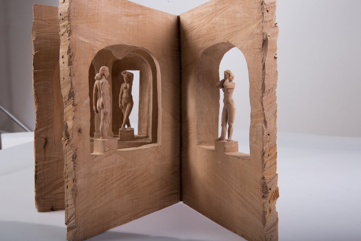 Franz Weidinger risveglia alla vita assi ruvide e crepate e travi grezze e massicce, tagliate di netto con la motosega da querce, peri e ciliegi; da queste fa uscire, come da un nido protettivo, piccoli corpi delicati, finemente scolpiti.