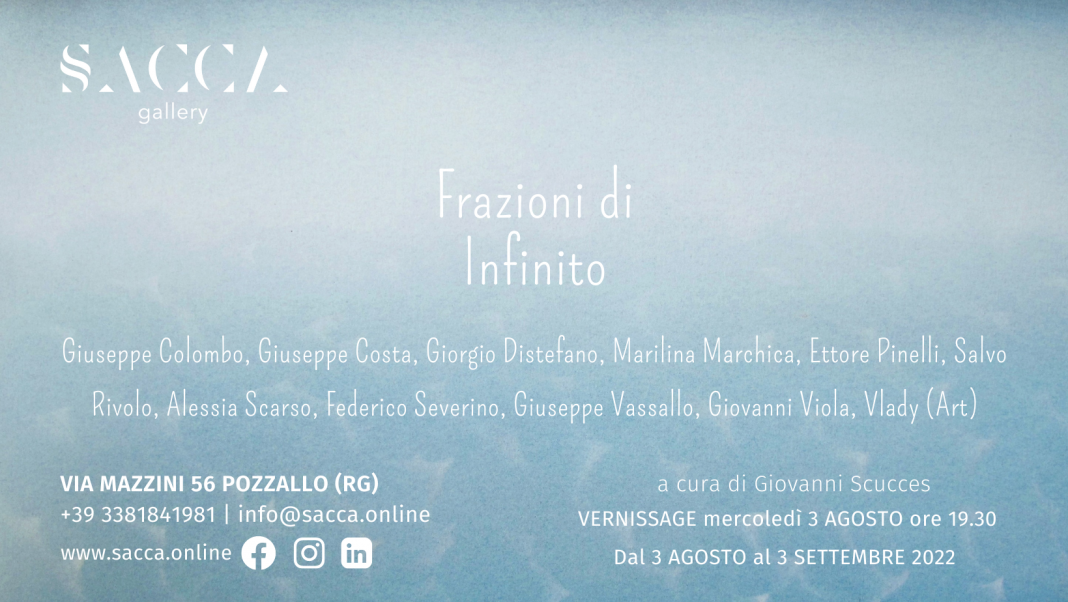 Che aspetto ha l’infinito? Difficile dirlo in maniera univoca. Tuttavia, prova a darne una chiave di lettura la siciliana galleria SACCA nella mostra “Frazioni di Infinito” attraverso gli 11 artisti chiamati ad esporre dal 3 agosto a Pozzallo.