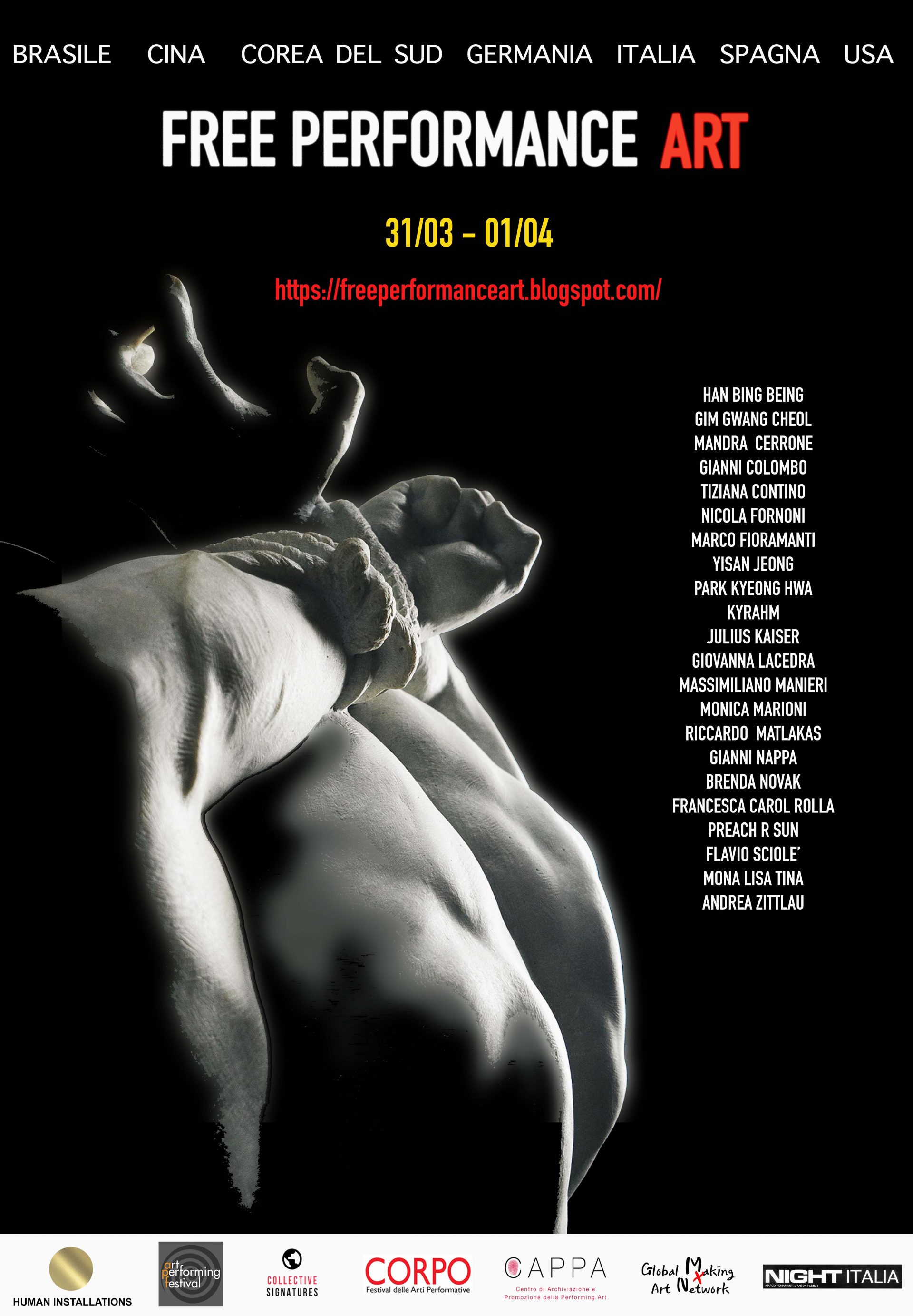 FREE PERFORMANCE ART è un progetto in collaborazione tra HUMAN INSTALLATIONS (Italia, Roma); ART PERFORMING FESTIVAL (Italia, Napoli); COLLECTIVE SIGNATURES (Spagna, Formentera); CORPO Festival delle Arti Performantive e CAPPA Centro di Archiviazione e Promozione della Performing Art (Italia, Pescara); Global Making Art Network (Corea del Sud), NIGHT ITALIA (Italia/USA)