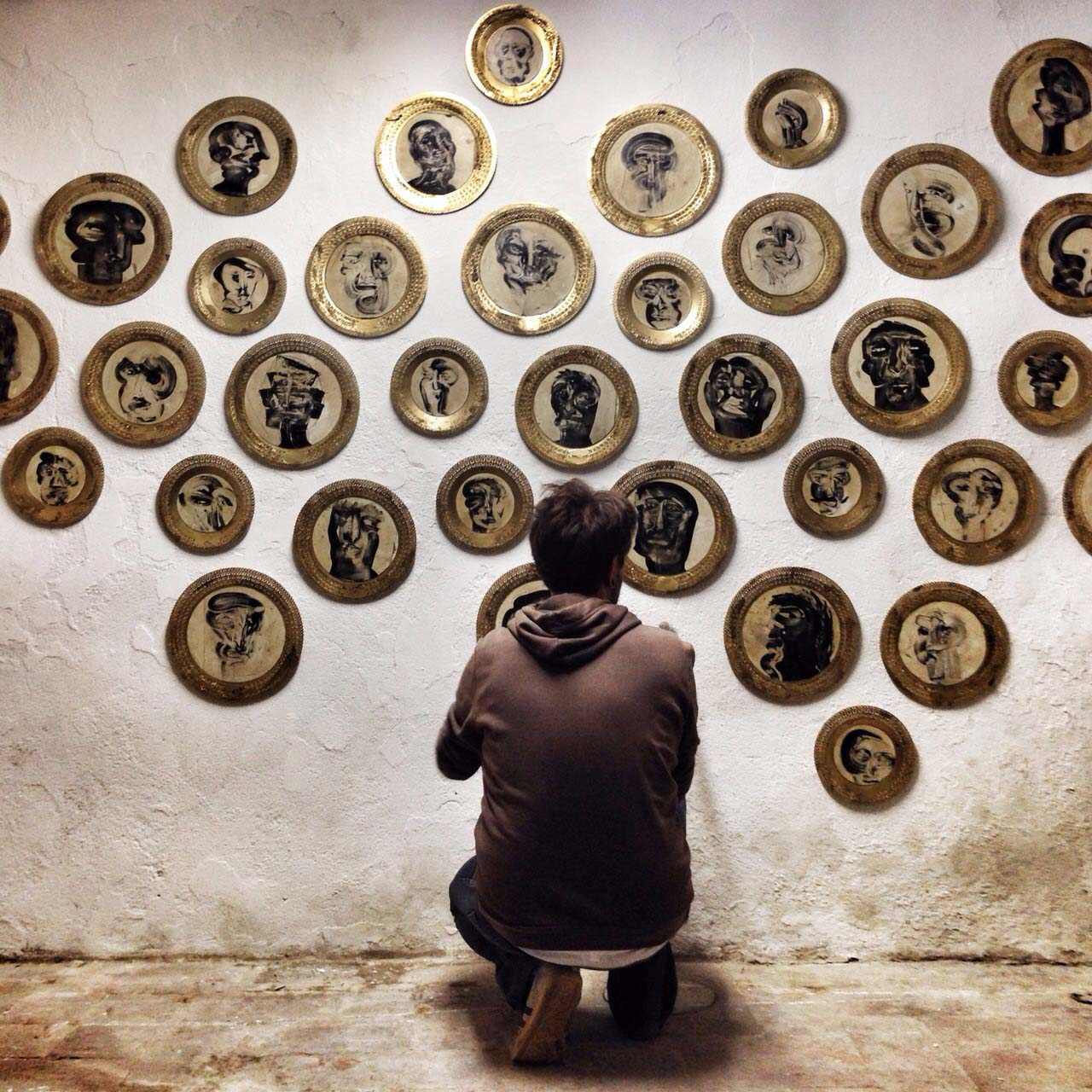 L’installazione “Non Noti” consiste in una serie di piatti industriali per torte posizionati su una delle pareti della sala, all’interno dei quali l’artista disegna con l’inchiostro di china alcuni volti frammentati di personaggi immaginari, non riconoscibili e non conosciuti. Da qui il titolo dell’
