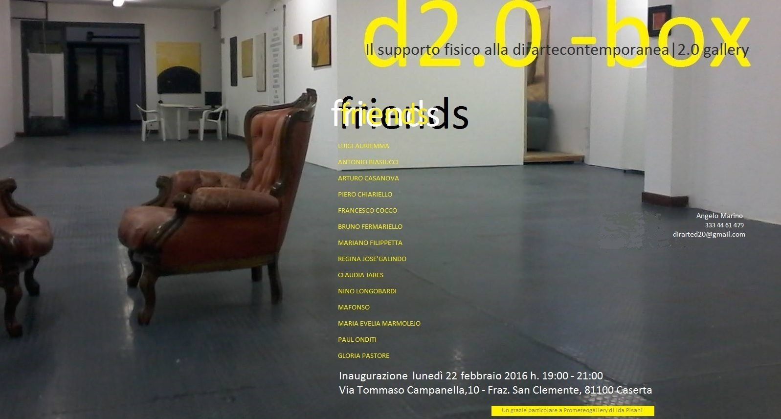 Il d2.0-Box nasce come supporto fisico alla galleria online in cui verranno inaugurate non solo le mostre della dirartecontemporanea|2.0 gallery ma anche una serie di incontri con artisti, scrittori, poeti, musicisti, critici e/o curatori d'arte per scambiare e trasferire esperienze, sensazioni, emozioni, progetti, dubbi con quanti vorranno seguirci. Non una nuova galleria – quella è e resta la dirartecontemporanea2.0 gallery nata nell’ottobre del 2012 - bensì un luogo in cui ed attraverso il quale offrire la possibilità di raccogliere energie creative e presentarle a tutti in forme nuove e fruibili nella ferma convinzione che le arti siano sempre più uno specchio privilegiato di incontro di sé e dell’Altro, una possibilità di scoprire nuove domande ed immaginare altrettante risposte. Per il suo “debutto in società” mi sono affidato, come da buona tradizione italiana, a delle madrine e padrini d’eccezione. Artisti amici ( e nella vita reale e nel web ) che hanno risposto, onorandomi del loro sincero assenso, al mio invito per la realizzazione di un group show quale viatico augurale per questo nascente presidio delle arti contemporanee su e per il territorio casertano e non solo. Vi aspetto lunedì 22 febbraio dalle 19:00 alle 21:00 in via Tommaso Campanella,10 nella piccola frazione di San Clemente in Caserta insieme alle opere ed agli artisti, alcuni presenti fisicamente altri solo idealmente non vivendo in Italia, di FRIENDS.