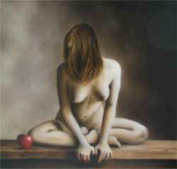 Simone Ermanno Galimberti si caratterizza per una sapiente rappresentazione di corpi e nature morte ove traspare una sottile inquietudine effetto di tensioni fra idealità e pulsioni vitali; ed è forse uno dei suoi dipinti (un’anonima Eva che fissa una mela) quello che illustra più chiaramente il tema. Il percorso di Elena Rudatis è invece di natura sperimentale, basato com’è sull’impasto di materiali antichi e modernissimi che agiscono sulle forme trasformandole energicamente. Il linguaggio artistico di Scegle si colloca in un ambito tra l’astratto e il figurativo dove costante è la ricerca continua di un senso mistico all’interno di complesse ed ermetiche figurazioni dal sapore allegorico. Gabriella Calandra sviluppa la tematica del “proibito” lungo i binari consolidati della figurazione tradizionale con particolare attenzione alle forme classiche. Alessandra Cameroni insinua nei risvolti di figure e atmosfere cariche di eros un interessante gioco di dinamismi cromatici che si impongono per la loro incisività. ( Paolo Avanzi ).