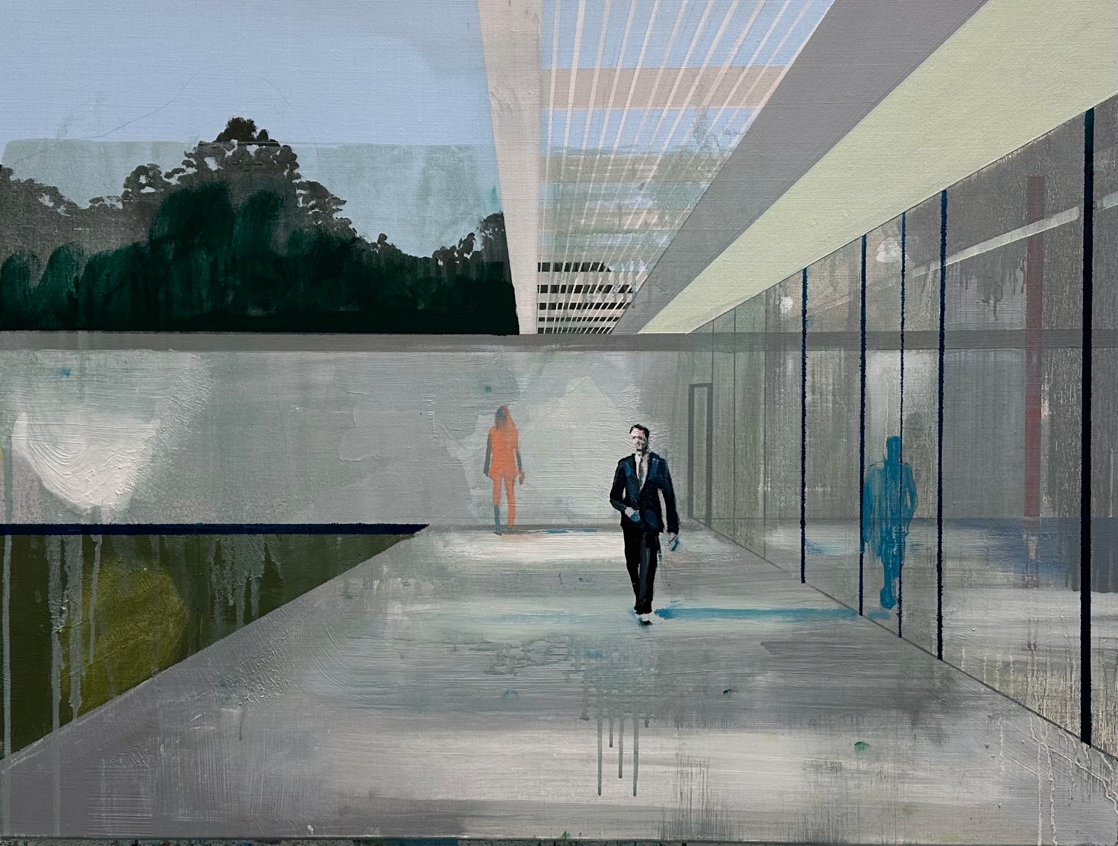 Le sue opere pittoriche emanano una sottile tensione psicologica ed evocano una latente atmosfera da film noir. Nel suo approccio compositivo, Blom adotta abilmente il ruolo di regista, utilizzando scenografie di sfondo come palcoscenico espressivo per svelare il dramma umano insito nei suoi racconti visivi. Nelle sue tele, una sapiente fusione di elementi geometrici, unita all'uso magistrale di linee diagonali e punti di fuga, evoca una forte atmosfera architettonica che ricorda le opere pionieristiche di Mies Van Der Rohe, Alvar Aalto, Le Corbusier e Walter Gropius, agli albori dell'architettura moderna. Allo stesso tempo, l'intento artistico dell’artista va oltre la mera rappresentazione di ambienti specifici; invece, mira a suscitare profonde sensazioni ed emozioni nello spettatore, stabilendo così il perfetto sfondo per le messe in scena dei suoi soggetti/attori.
