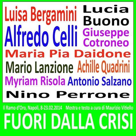 La mostra “Fuori dalla crisi”, allestita nell’accogliente “home-gallery” vomerese di Vincenzo Montella, sensibile operatore delle arti visive a Napoli, desidera rispondere all'esigenza di promuovere, efficacemente, la creatività degli artisti in rapporto alle tendenze culturali del territorio nazionale, nonché delle proiezioni concettuali parallele a considerazioni di sapore euro-mediterraneo per uscire dalla fortissima crisi, che, soprattutto, l’Italia ha dovuto sopportare. “Fuori dalla crisi” rilancia una traccia, seppur minima, di verifica dello stato dell'arte in Italia; è un incontro significativo tra artisti di diverse aree geografiche italiane. Sono presenti: Luisa Bergamini, Lucia Buono, Alfredo Celli, Giuseppe Cotroneo, Maria Pia Daidone, Mario Lanzione, Nino Perrone, Achille Quadrini, Myriam Risola, Antonio Salzano. Da specificare che Giuseppe Cotroneo, Mario Lanzione e Antonio Salzano formano, oggi, il Gruppo “Astrattismo Totale”. Questa rassegna d’arte, che vede insieme dodici indicative presenze con relative recentissime opere d’arte realizzate con diversi codici linguistici, vuole essere un segnale, quasi un concorso ideale per dimensionare un ulteriore contributo di riscontro delle condizioni dell’arte italiana. L’esposizione incapsula, senz’altro, “sensi mediterranei" di artisti di varie località italiane e con all’attivo varie personali, numerose collettive e diverse rassegne, di grande importanza, da “La Quadriennale” di Roma sino a “La Biennale” di Venezia curata da Vittorio Sgarbi. Sollecitazioni, aperture, istanze, pressioni, tensioni, lieviti, stimoli, esiti, palpiti, espansioni e risultati di ricerche vivono nelle loro opere ben legandosi all’urgenza e alla necessità di confrontarsi. Questi artisti, certamente di tono e di qualità, da molti anni sulla scena artistica nazionale, e non solo, differenti per caratteri, ma di spessore e di grande impegno, offrono un serio ventaglio di misurate declinazioni del linguaggio pittorico. Correnti direttive di molteplici modalità espressive convergono per manifestare attendibili interventi e per specificare una possibile misurata ricognizione. Questi artisti con lavori di ricerca, seriamente conosciuti e ampiamente riconosciuti, sostengono un contemporaneo visivo di temperamento euro-mediterraneo e attivano, così, oggi, una prova espositiva per alimentare, in fondo, una resistente apertura futura. Bisogna sottolineare che la creatività nel Mezzogiorno risulta sempre in crescita e i risultati delle varie indagini in campo hanno bisogno di luoghi di confronto per eventuali incontri e discussioni. La serena filosofia di quest'incontro, improntato al confronto di stili, permette al territorio partenopeo di poter recepire un momento squisitamente visivo-culturale, mentre all'orizzonte si tratteggiano ulteriori spunti per scambi aggreganti di nuovi progetti. In quest’esposizione s’incontrano vite vissute; nelle opere si riflettono attraversamenti memoriali; difatti, nelle cognizioni artistiche che si pronunciano la memoria è recepita come cortina iniziale, fondo d’avvio, mentre passaggi diaristici rafforzano e consolidano un campo di profili evocativi, aggettanti, risonanti. Alza il livello qualitativo la metabolizzazione di estremi, quelli epocali e quelli intimistici, quelli sociali e quelli domestici; ogni artista sa delimitare un proprio ambito di ricerca, finitimo agli altri; le rispondenze estetiche vibrano, squillano e si specchiano, nonché movimenti e intrecci rafforzano congetture e rilanciano rimandi. L’incontro vivifica la comunicazione, risana il sentire comune. Arrestare la memoria per assicurarla come testimonianza del vissuto e giungere e sommare anche la pronuncia diaristica permette di rivedere il passato e regolare il presente per “graffiare” il futuro; e sembrano scattare altri possibili incontri di pensieri. Questa mostra è un fecondo meeting di paralleli segni incisi e di espressioni raccolte sul “fil rouge” del ricordo, associato e spinto dalla voglia di andare oltre per poi avvicinarsi a replicare cadenze del motivo del ricordo, quasi a voler rinnovare una sorta di andirivieni tra consumati trascorsi e realizzabili futuri. Le interpretazioni di questi artisti fanno proprio le più liberali ricerche e si articolano a captare movimenti e gesti, la vita con ciò che ci circonda e con ciò che ci abbraccia.