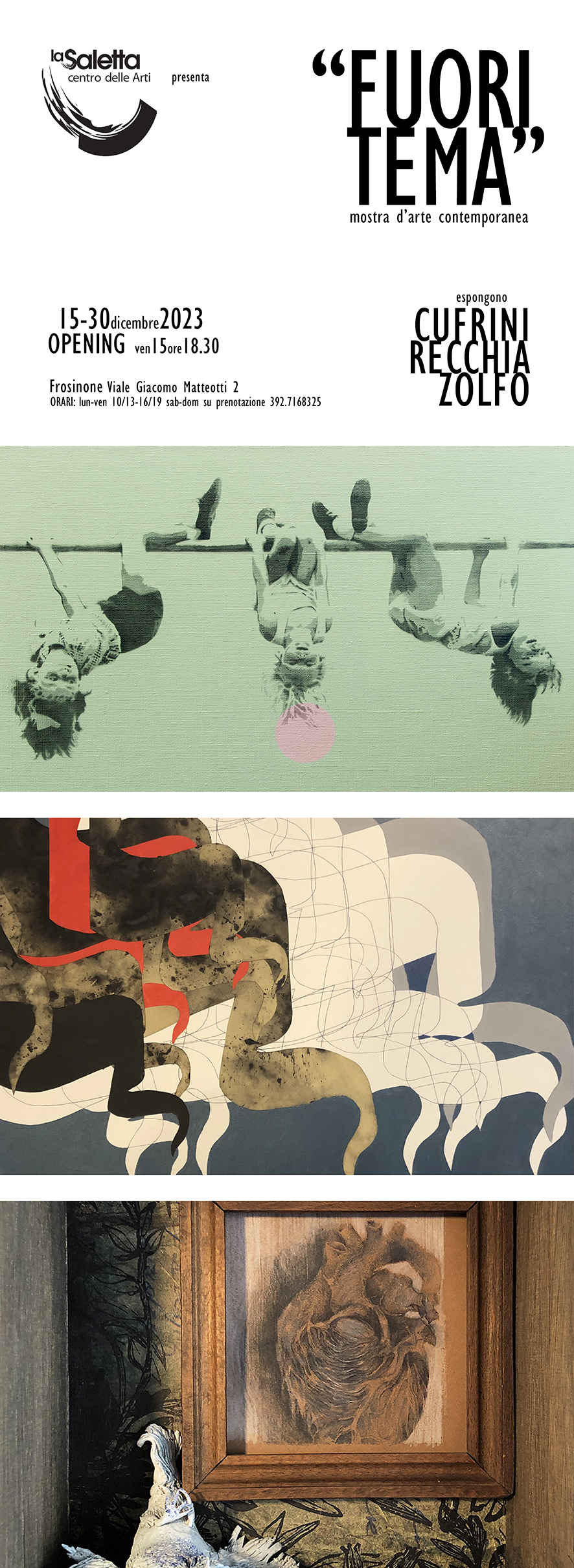 Inaugura venerdì 15 dicembre alle 18.30 la mostra “Fuori Tema”, presso la storica Saletta di Gualdini, Centro delle arti, in via Giacomo Matteotti a Frosinone. Gli artisti presenti in mostra sono Umberto Cufrini, Emiliano Recchia e Alessia Zolfo, colleghi da anni, che vivono e operano nel campo delle arti visive nella provincia di Frosinone. Proprio nel cuore del capoluogo ciociaro hanno scelto di condividere questo spazio espositivo, per presentare alcune delle loro ultime opere, anche con l’intenzione di valorizzare qualitativamente la crescita culturale del territorio. La continua ricerca espressiva e la perseveranza operativa sono denominatori comuni ai tre artisti, che scelgono come “modus operandi” tra i vari strumenti del linguaggio visivo, prevalentemente quello della pittura.