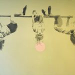 Cufrini nelle sue grandi opere perlopiù monocrome, inserisce figure isolate di bambini spensierati e intenti al gioco, ancora lontani dagli schermi ipnotici della tecnologia, che pure appare e si fa avanti, espandendosi all’orizzonte.