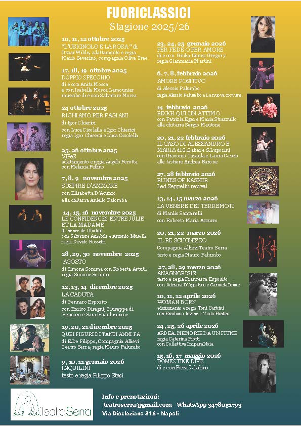 Martedì 16 settembre, ore 11:00 conferenza stampa per la stagione 2025/26 “Fuoriclassici” del Teatro Serra di Napoli. A Fuorigrotta, in Via Diocleziano 316. Info: teatroserra@gmail.com, 347.8051793.