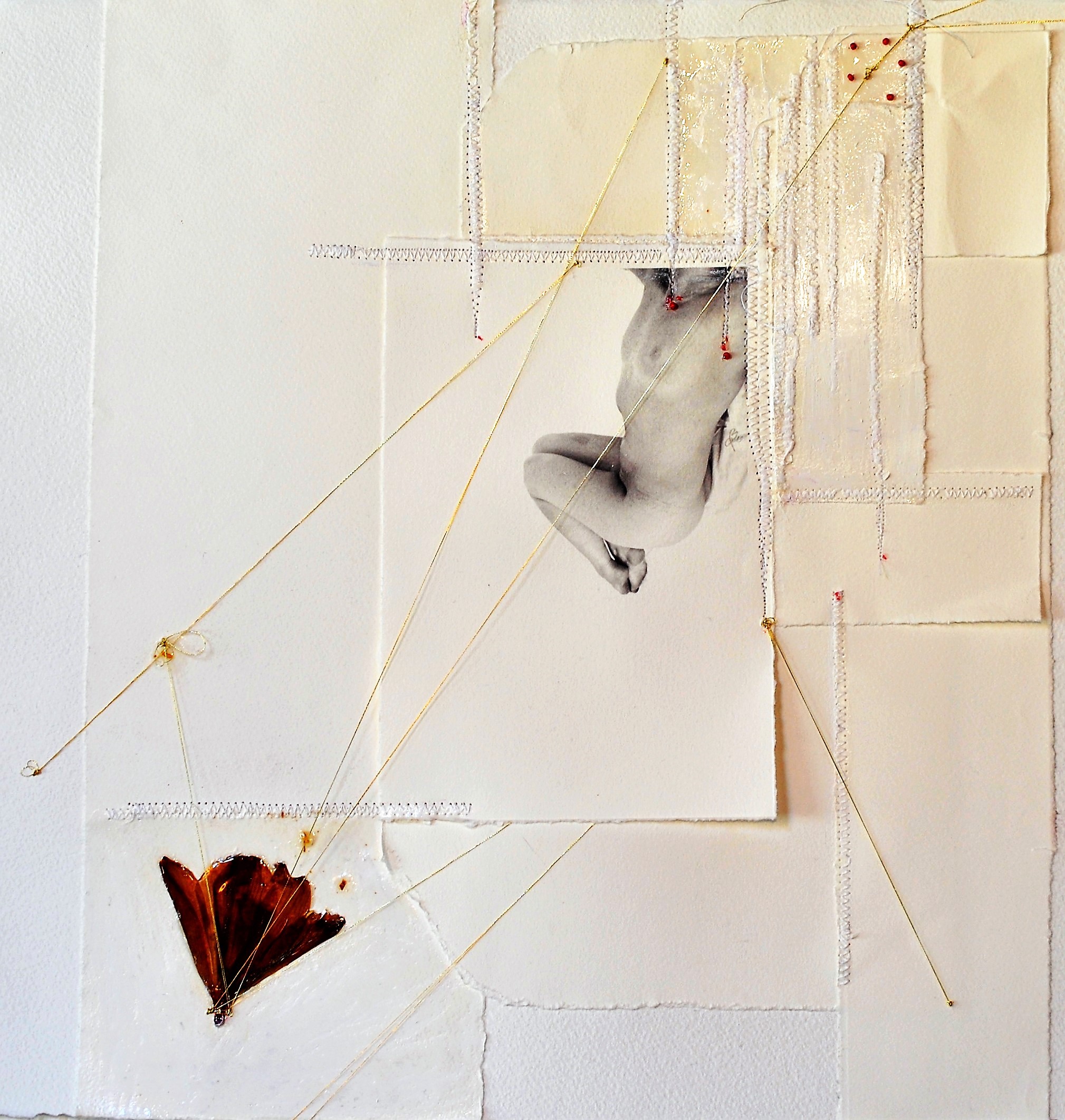 Il nudo, maschile e femminile, è l’oggetto del desiderio da manipolare, trasformandolo di volta in volta in pesce, in graffio cromatico, in arabesco, in squisite tonalità confondendo i sessi e impacciando i sensi. Il corpo dalle sinuose curve diventa palcoscenico e al contempo scenografia. Su di lui, sul soffice palco, ci immaginiamo le leggiadre ninfe danzare e, ad ogni volteggio, srotolare lunghi fili d’oro – come nella fiaba di Tremotino – o rossi come il sangue che porta la vita, o ancora bianchi come la speranza per il futuro. Opere candide quelle di Barbara Cappello, esenti dalla torbida presenza delle tre Parche, Cloto, Lachesi e Atropo: loro, in realtà, non filano ma tessono il filo del fato e mai sappiamo quando Atropo, tagliando il filo, recide la vita. Ma questa è un’altra storia, un altro mito da cui questi lavori si tengono ben lontani.
