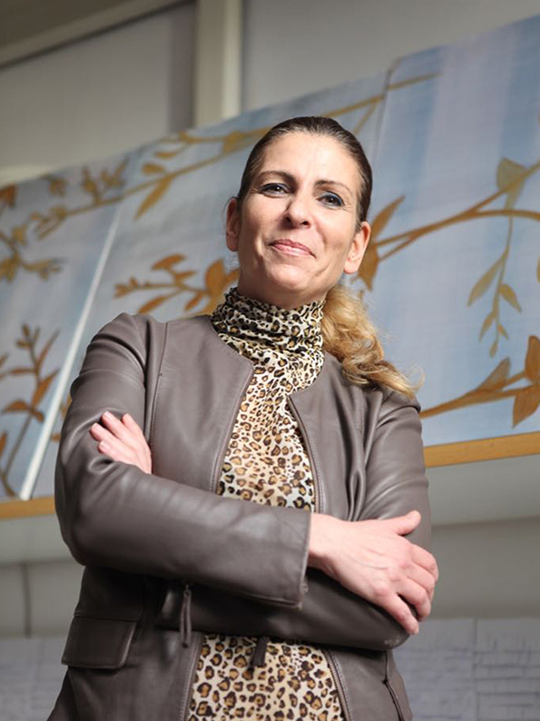 Angela Florio espone paraventi per esterni e interni che hanno una particolarità data non solo dall’estetica, ma anche dalla funzionalità in quanto sono impermeabili e pertanto utilizzabili anche in esterno. Il decoro è in stampa digitale, in TNT che permette una resistenza in esterno ad acqua e umidità. La struttura che sorregge il decoro è realizzata in metallo verniciato; Giardino d’inverno ovvero foglie in forma di sculture. Ogni foglia è un calco istantaneo di un pezzo di natura, trasformato in arte. L’ispirazione nasce dalla osservazione della natura stessa, immortalata attraverso garze gessate, quasi a trattenere la forma che la natura assume per la sua esistenza. L’insieme di foglie auto sorrette da basi e in varie altezze, forma un ‘giardino d’inverno’ per la tavole o per l’ambiente che si vive; Tropical Lumina Gems, paralume gioiello che nasce in collaborazione con Thais Bernardes Milano, gioielleria che trasforma ogni pezzo in una testimonianza tangibile dell'incontro tra l'eleganza italiana e la maestosità dei tropici. La lampada da terra a stelo con paralume ornato con carta digitale è arricchita da decori che sono veri gioielli. I protagonisti sono uccelli tropicali impreziositi da gemme colorate, inseriti in un mondo magico.